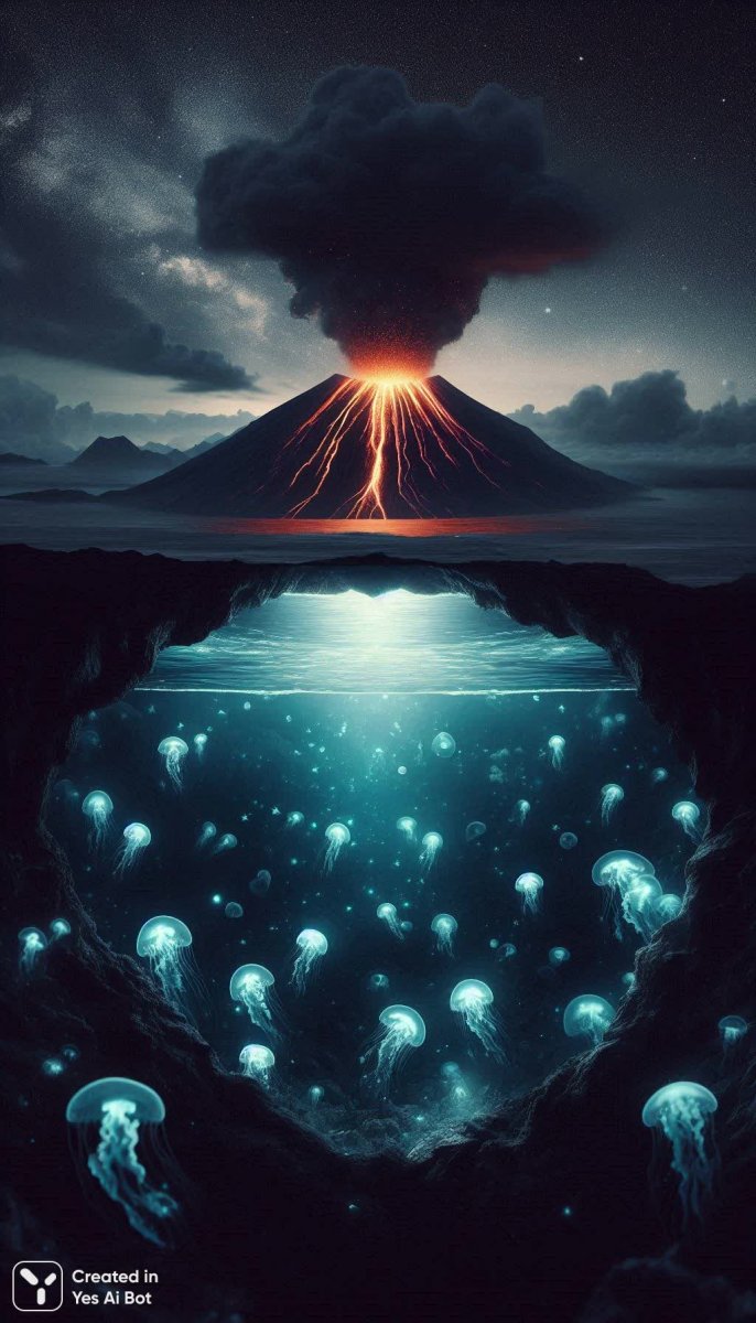 Завораживающее двойное изображение, где разрушительная мощь вулкана сталкивается с безмятежной красотой океанских глубин. Четкий силуэт извергающегося вулкана служит фоном для сюрреалистичной сцены внутри его жерла – спокойный подводный мир, полный мерцающих биолюминесцентных медуз и лучей солнца, пробивающихся сквозь толщу воды. Этот контраст создает ощущение нереальности, словно два разных мира существуют в одном пространстве. Над кратером вулкана бушуют грозовые тучи, символизирующие хаос и перемены, а под ним простирается безмолвная, таинственная бездна, олицетворяющая вечность и неизведанное. Сочетание этих элементов порождает глубокое эмоциональное воздействие, вызывая одновременно трепет перед силами природы и умиротворение от созерцания красоты подводного царства. Изображение пронизано поэтическим настроением, где противоположности не борются друг с другом, а гармонично сосуществуют, создавая удивительную визуальную метафору о цикличности жизни и неразрывной связи между хаосом и порядком, светом и тьмой, разрушением и созиданием. Это произведение искусства заставляет задуматься о хрупкости нашего мира и его бесконечном разнообразии, вдохновляя на поиск красоты в самых неожиданных местах. Картина вызывает сложные, противоречивые чувства, от восхищения до тревоги, оставляя неизгладимый след в сознании зрителя