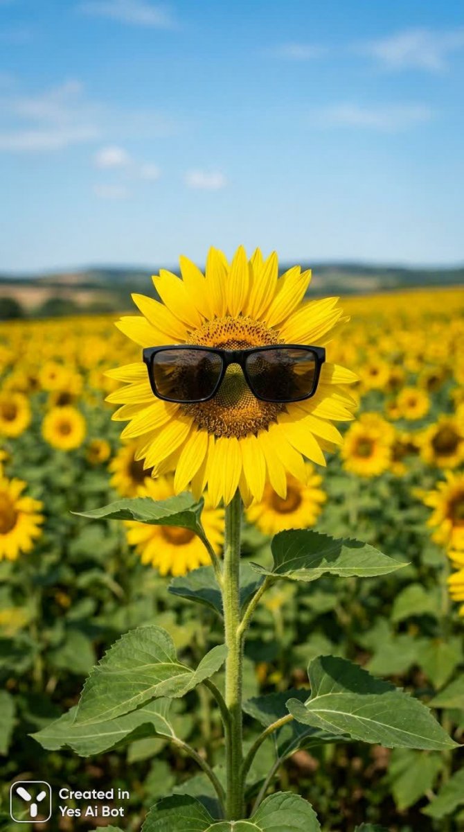 Яркий подсолнух занимает центральное место в кадре, его лучистые желтые лепестки расходится во все стороны. На лице цветка удобно расположились темные прямоугольные солнцезащитные очки, скрывающие сердцевину и создающие забавный антропоморфный эффект. Подсолнух повернут прямо к зрителю, его большая голова слегка наклонена вверх. Толстый зеленый стебель поддерживает крупные темно-зеленые листья. На заднем плане простирается размытое поле подобных подсолнухов, уходящее вдаль под ясным голубым небом. Естественное солнечное освещение отбрасывает легкие тени на листья. Ракурс расположен на уровне глаз, создавая ощущение взгляда вверх на этот необычный цветок. Общая атмосфера – радостная и причудливая, выполненная в фотореалистичном стиле. Это яркое и жизнерадостное изображение, сочетающее в себе красоту природы и элемент юмора. Контраст между естественной яркостью подсолнуха и искусственным элементом очков создает запоминающийся визуальный образ, вызывающий улыбку и ощущение легкости. Работа выполнена с большой точностью и вниманием к деталям, что подчеркивает реалистичность изображения. Кажется, будто цветок действительно надел очки для защиты от солнца или просто хочет добавить немного стиля в свой солнечный день. Этот кадр идеально подойдет для тех, кто ценит позитивные эмоции и любит необычные сочетания