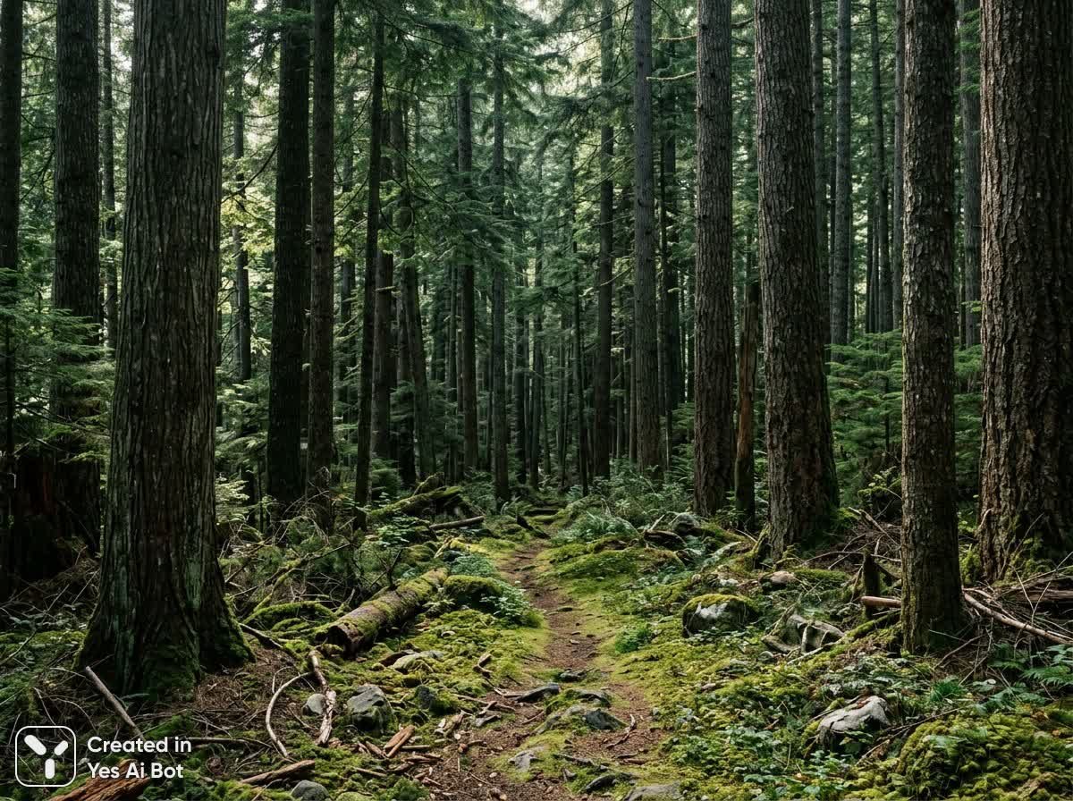Завораживающая панорама густого хвойного леса, где величественные деревья возвышаются над зрителем, создавая ощущение глубины и умиротворения. Земля утопает в мягком ковре из изумрудного мха, перемежающегося с валунами и опавшими ветвями. Едва заметная тропинка петляет между стволов, приглашая к путешествию вглубь леса. Солнечные лучи пробиваются сквозь плотный полог листвы, рисуя на земле причудливый узор из света и тени. Этот эффект подчеркивает фактуру коры деревьев и густой листвы, наполняя пространство ощущением реалистичности и природной красоты. Цветовая гамма выдержана в спокойных тонах: глубокие зеленые оттенки, землистые коричневые и приглушенные серые цвета создают атмосферу таинственности и умиротворения. Композиция построена таким образом, чтобы зритель почувствовал себя частью этого лесного мира, будто он сам стоит на уровне глаз с деревьями и смотрит в их бесконечную даль. Каждое дерево, каждый камень, каждая травинка проработаны с удивительным вниманием к деталям, что придает изображению невероятную реалистичность. Свет играет ключевую роль в создании настроения: он мягко освещает все вокруг, подчеркивая красоту природы и создавая ощущение сказочной атмосферы. Это не просто изображение леса – это погружение в его тишину, спокойствие и загадочную прелесть, где каждый шорох листвы кажется волшебным шепотом