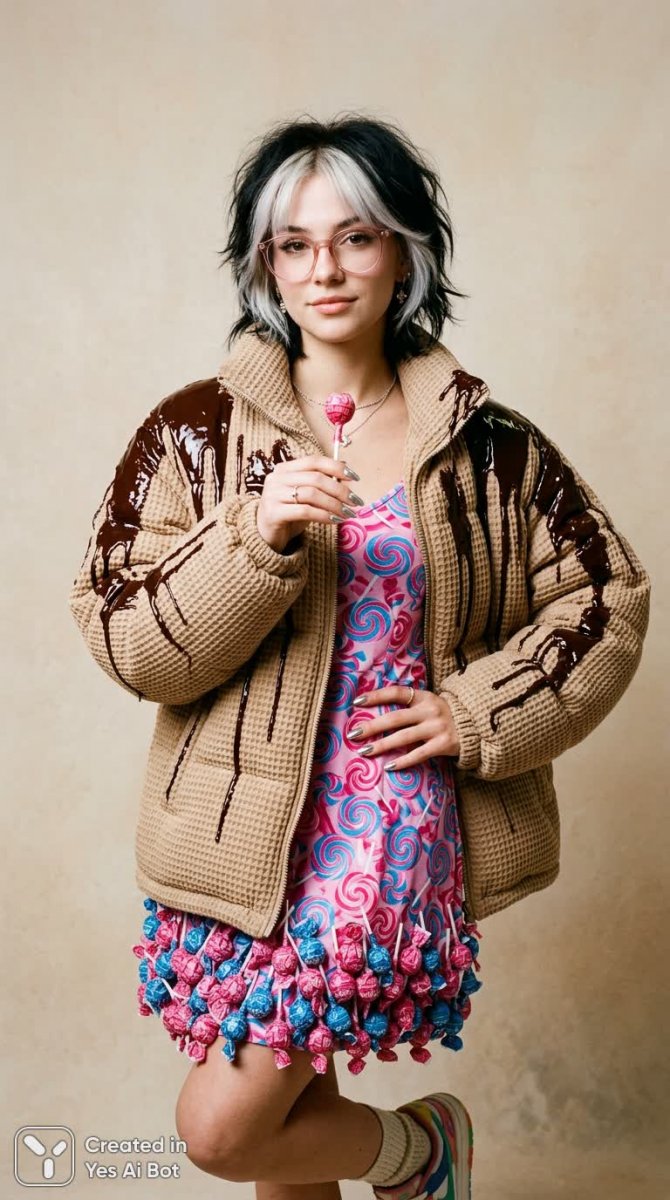 girl with short wet-look dark hair, platinum bob accents, wearing oversized puffer jacket with waffle texture and glossy chocolate drips, large pink glasses, candy dress in pink and blue lollipops peeking from hem, delicate skin, silver manicure, hands posed elegantly, BG beige, fashion photo. Image: high-contrast studio shot, hyper-realistic textures of pastry-like jacket and candy dress, close-up to knees, glossy highlights on chocolate, soft beige backdrop.