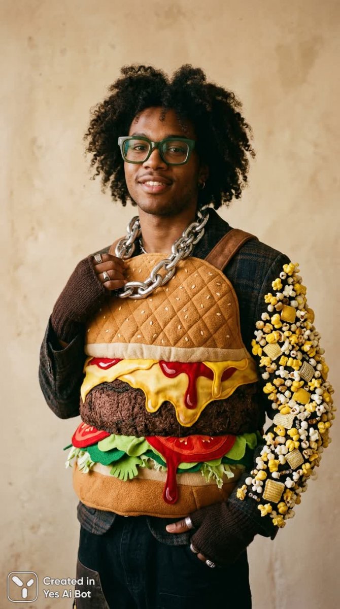 Яркий и запоминающийся концептуальный снимок демонстрирует уверенного молодого человека в экстравагантном образе. Его короткие кудрявые темные волосы контрастируют с необычным жилетом, стилизованным под гамбургер – булочки, котлеты и кетчуп создают дерзкий и игривый эффект. Массивная цепь на шее добавляет образу бунтарства, а толстые зеленые очки подчеркивают его индивидуальность. Коричневые кожаные перчатки без пальцев завершают ансамбль, добавляя нотку уличного стиля. Интересная деталь – рукав куртки, украшенный попкорном, привносит элемент неожиданности и легкости. Фотография выполнена в портретном формате до пояса на однотонном бежевом фоне, что позволяет полностью сосредоточиться на модели и его одежде. Теплая цветовая палитра создает уютную и располагающую атмосферу. Особое внимание заслуживают ткани с текстурой еды – они словно оживляют образ, делая его еще более интересным и запоминающимся. Насыщенное студийное освещение подчеркивает детали и придает снимку глубину. Уверенное выражение лица молодого человека завершает картину, демонстрируя его харизму и неповторимый стиль. Это не просто фотография – это манифест креативности и самовыражения в мире моды, сочетающий дерзость и элегантность в одном образе. Концептуальный подход к созданию образа делает этот снимок настоящим произведением искусства, которое привлекает внимание и вызывает восхищение своей оригинальностью