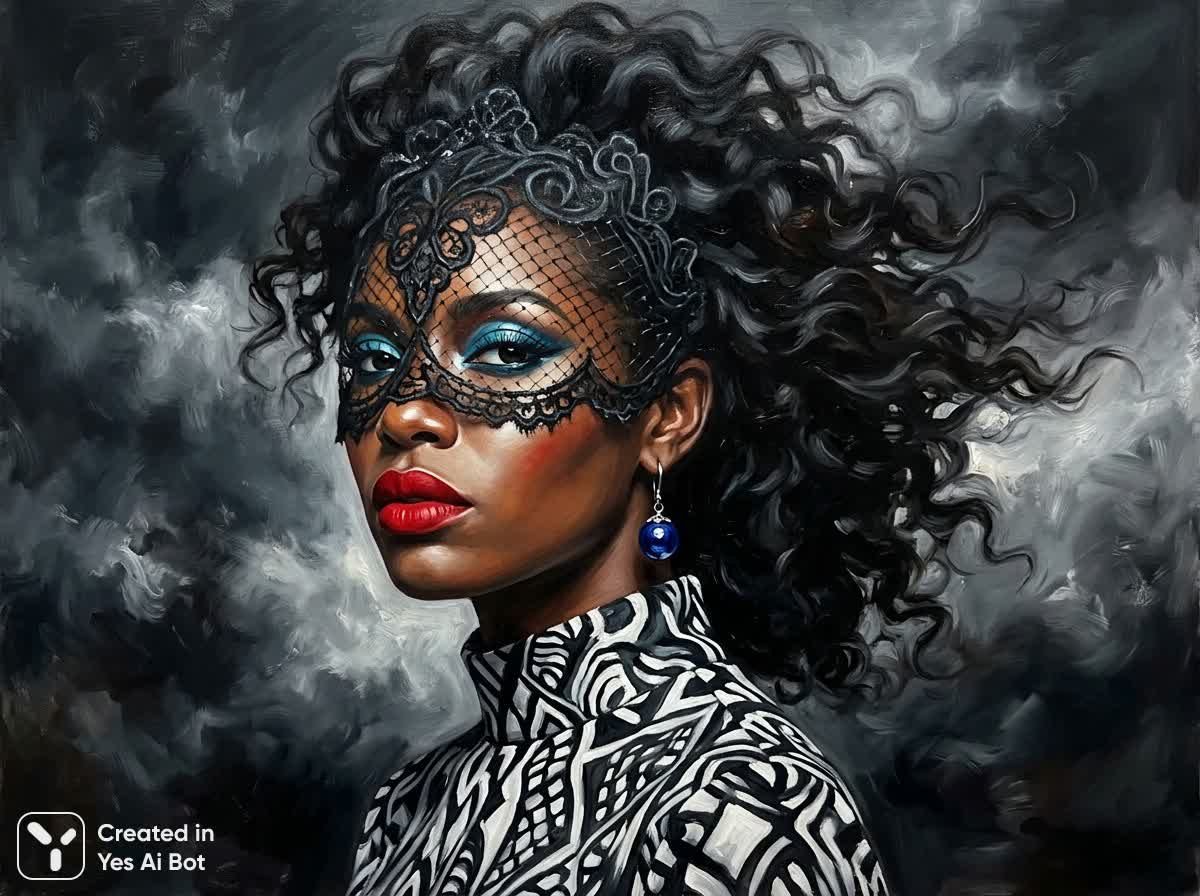 Изысканный портрет молодой женщины, чьи черты словно окутаны тайной и драматизмом. Встречая взгляд зрителя в элегантном трехчетвертном профиле, она предстает воплощением загадочной красоты и аристократической сдержанности. Черты лица подчеркнуты ярким макияжем: выразительные голубые тени и насыщенные красные губы контрастируют с приглушенными тонами окружающей среды, создавая эффектную визуальную игру. На ее глазах – роскошное черное кружевное покрывало, придающее образу неповторимую интригу и скрывающее часть лица, словно намекая на глубокие переживания или тайны прошлого. Темные волосы, уложенные в сложную и величественную прическу, развеваются на ветру, сливаясь с бушующим, грозовым фоном, который усиливает драматический эффект. Она одета в изящное платье с высоким воротником, украшенное черно-белым абстрактным узором, добавляющим портрету современности и оригинальности. В правом ухе сверкает одинокий серебряный клип в виде синего сферического кулона – деталь, подчеркивающая индивидуальность и изысканный вкус. Световые акценты, играющие бликами на лице и фоне, создают ощущение таинственности и напряжения, словно заставляя зрителя задуматься о скрытых смыслах и эмоциях. Фон представляет собой абстрактное вихревое скопление темных серых и белых тонов, напоминающее клубы облаков или дыма, что добавляет портрету глубины и динамики. В целом, это произведение искусства отличается реалистичным, но в то же время живописным стилем, передающим атмосферу драматизма, артистичности и глубокой эмоциональности. Акцент сделан на изображении головы и плеч, что позволяет зрителю сосредоточиться на лице и изысканной прическе, являющихся ключевыми элементами портрета