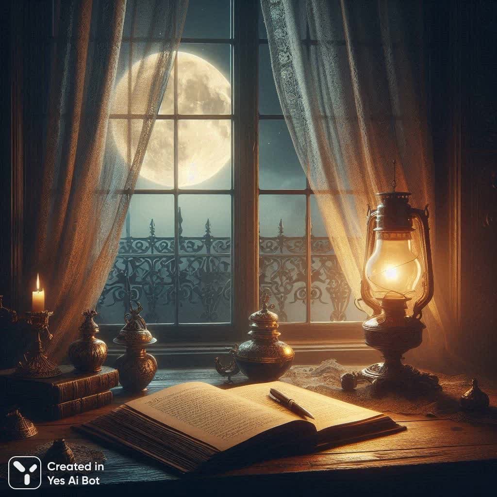 Тихая комната погружена в сумрак, лишь бледный свет луны проникает сквозь слегка приоткрытое окно, где нежная занавеска танцует под порывами ветра. Атмосфера спокойствия и созерцания царит в этом уединенном пространстве. В центре внимания – старинный стол, на котором раскрыта книга, словно ожидающая продолжения истории или нового вдохновения. Рядом с ней элегантно расположились чернильница с насыщенным чернилами и изящное перо, готовые воплотить мысли в слова. Мягкий свет масляной лампы, стоящей рядом, создает интимную атмосферу, подчеркивая таинственность момента и приглашая окунуться в мир воображения и творчества. Комната словно замерла, храня в себе секреты прошлого и ожидая новых откровений, а лунный свет, проникающий сквозь окно, добавляет ей загадочности и романтики. Это место, где время останавливается, позволяя насладиться тишиной, размышлениями и красотой простых вещей. Кажется, будто автор только что отвлекся, оставив незаконченную запись в надежде вернуться к ней позже. Все вокруг дышит спокойствием и творческим вдохновением, создавая идеальную обстановку для погружения в мир литературы или собственных мыслей
