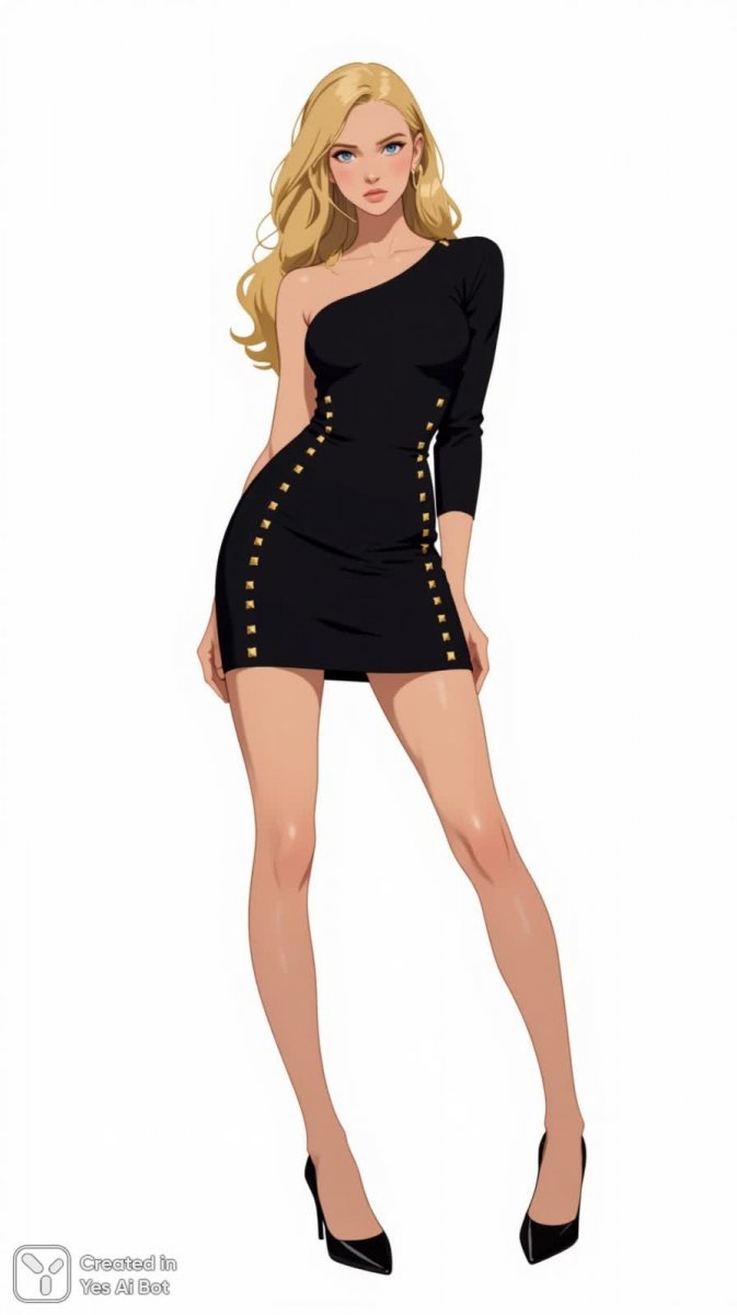 Изысканный портрет молодой женщины, выполненный в стиле современной модной иллюстрации. В центре внимания – элегантная фигура, запечатленная в динамичной позе с уверенным взглядом прямо в камеру. Образ дополняет короткое черное платье-комбинация с одним плечом и длинными рукавами, эффектно облегающим силуэт. Лиф платья украшен золотыми заклепками, добавляющими нотку дерзости и роскоши. Мини юбка средней длины, выполненная в контрастном черном цвете, гармонично сочетается с изящной обувью – лаконичными черными туфлями-лодочками на шпильке заостренным носком. Длинные волнистые волосы цвета блонд придают образу мягкости и женственности. Макияж выполнен в минималистичном стиле, подчеркивая естественную красоту модели. Фон – однотонный белый, акцентирующий внимание на деталях костюма и выразительном лице героини. Мягкое освещение создает атмосферу утонченности и элегантности, характерную для глянцевых модных изданий. Использование высококачественных текстур и деталей позволяет передать мельчайшие нюансы фактуры ткани и игру света на поверхности волос, обеспечивая реалистичность и визуальную привлекательность иллюстрации. Общий стиль изображения – современный, изысканный и элегантный
