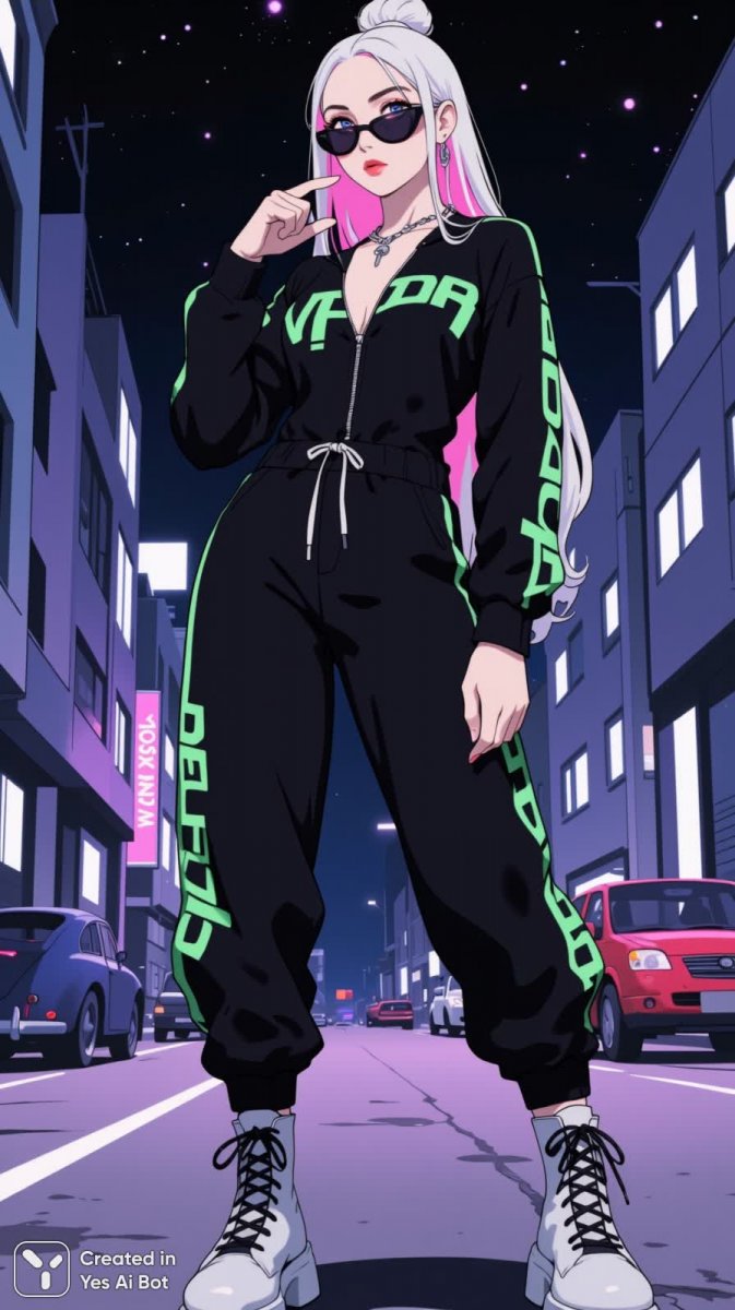 neon green logo printed zip front bodysuit partially unzipped deep v neckline, form-fitting long sleeves, black drawstring joggers low on hips, model with topknot bun and long straight platinum hair with pastel streaks, oversized cat-eye sunglasses slid down, delicate silver chains and cross pendant, chunky white platform combat boots with black laces and lug soles, subtle contour makeup long lashes glossy lips, right hand index finger to lips shushing gesture, manicured pale pink nails, urban nightscape bg with specular highlights — diva mode, please applaud ;)