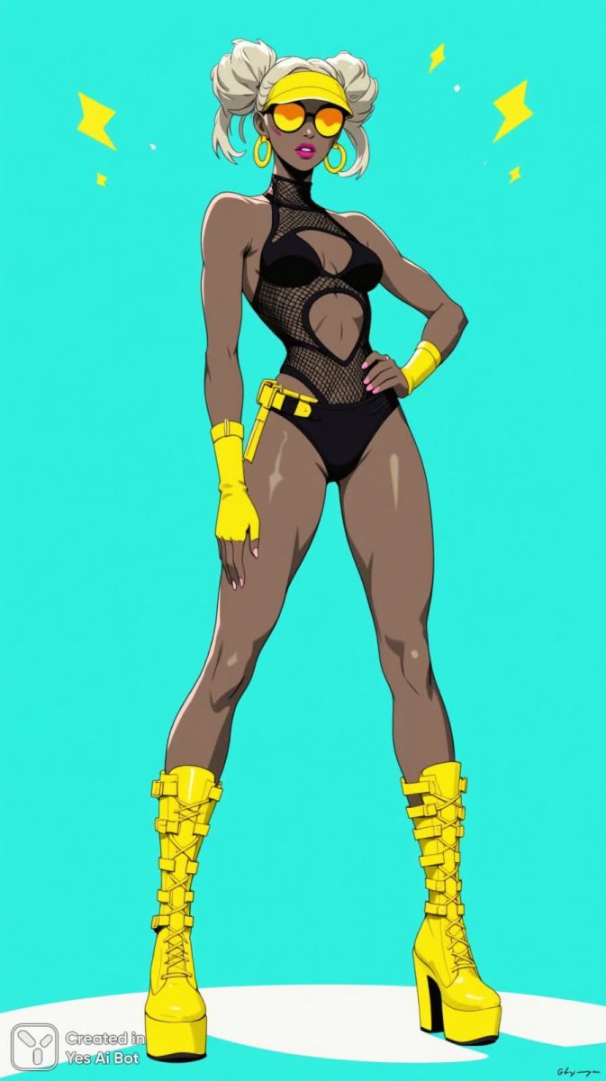 Яркий и дерзкий образ современной футуристической дивы захватывает внимание своей контрастной палитрой и смелыми деталями. Неоново-желтый визор на солнцезащитных очках придает взгляду хищную уверенность, а платиновые косы с заплетенными элементами добавляют нотку космической элегантности, несмотря на легкую небрежность прядей. Черный сетчатый боди с вырезами на груди и декоративными вставками по бокам подчеркивает изящную фигуру, а высокая бикини-трусиха создает эффект соблазнительной игривости. Завершают этот смелый ансамбль неоново-желтые ботфорты с ремешками на платформе и пряжками, которые визуально удлиняют ноги и добавляют образу динамики. Поза с рукой на бедре демонстрирует уверенность и непринужденность модели - высокой и стройной женщины, ставшей центральным объектом внимания. Фоном служит однотонный бирюзовый фон, который подчеркивает яркость цветов и создает ощущение простора. Использование HDR-технологии и неонового свечения придает изображению глубину и загадочность. Маленькие золотые сережки-кольца и аккуратные ногти нежно-розового оттенка добавляют образу завершенности, а легкий контуринг подчеркивает достоинства лица. Вся композиция пронизана игривой атмосферой сценического освещения, создавая ощущение динамичности и энергии. Студийный свет и эффект линзовых бликов усиливают визуальный эффект, а завершающий штрих – комичный эмодзи, добавляет образу нотку юмора и самоиронии, делая его еще более запоминающимся и привлекательным. Этот образ - это смелое сочетание моды, футуризма и уверенности в себе
