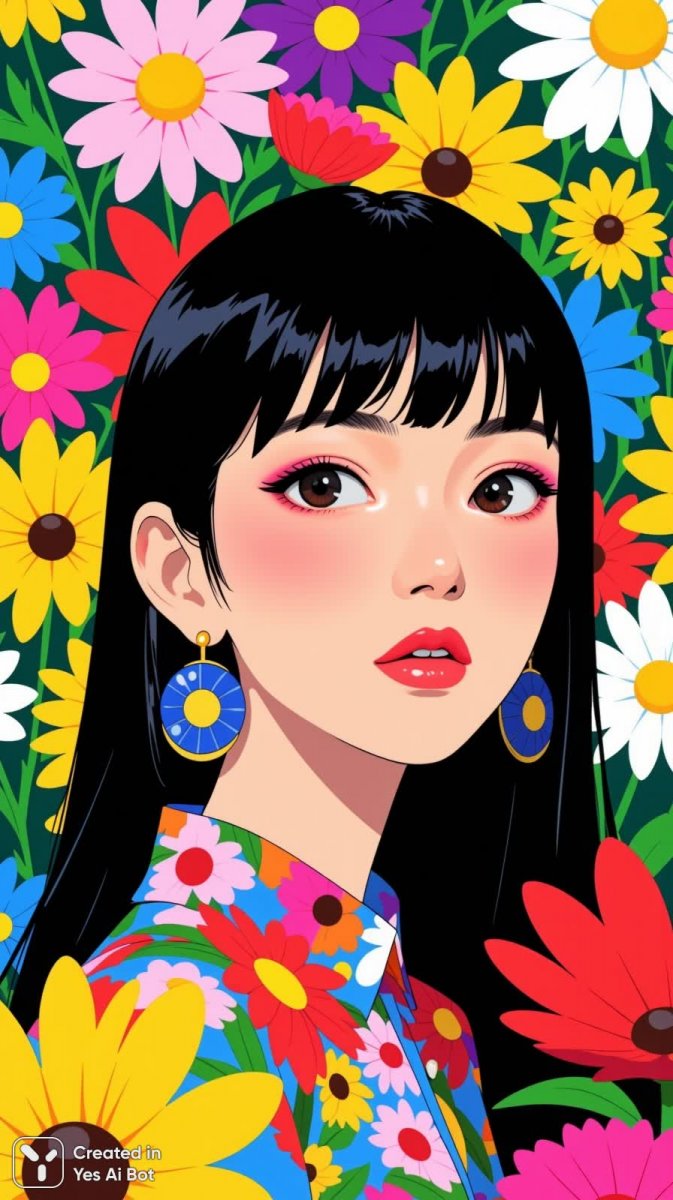 Яркий портрет молодой азиатской женщины в стиле поп-арт, словно сошедший со страниц глянцевого журнала. Её длинные чёрные волосы с прямой челкой обрамляют лицо, над которым играет дерзкий макияж: розовые тени на веках и насыщенная красная помада добавляют образу выразительности и энергии. Крупные серьги привлекают внимание, а яркая рубашка в цветочный принт подчеркивает жизнерадостность момента. Вокруг модели буйствует красочный сад из реалистично прорисованных многоцветных цветов – ромашек, васильков, маков и других экзотических растений. Иллюстрация выполнена с использованием сочных, насыщенных оттенков и высокого контраста теней, что создает эффект глубины и объемности. Фон полностью заполнен множеством разноцветных цветов, усиливая общее впечатление от картины. Это не просто портрет – это взрыв цвета и эмоций, воплощенный в ярком поп-арте. Каждая деталь продумана до мелочей: от выразительного макияжа до детализированной прорисовки каждого лепестка. Высокое качество изображения и тщательно подобранная цветовая палитра делают эту иллюстрацию настоящим произведением искусства, идеально подходящим для обложки журнала или рекламного постера. Взгляд зрителя притягивается к смелой композиции и ярким краскам, заставляя задуматься о красоте и энергии молодости