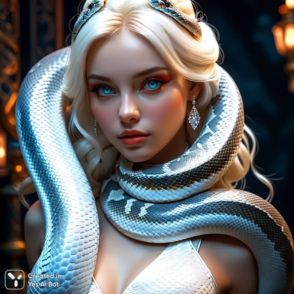 Завораживающая сцена, выполненная в реалистичной компьютерной графике, представляет собой крупный план с высоты птичьего полета. Молодая женщина нежно покоится на полу, ее лицо устремлено к руке в расслабленной позе. Ее платиновые волосы с прямым челка элегантно обрамляют лицо, а отдельные пряди выглядывают из-под наполовину надвинутого капюшона, добавляя образу загадочности. Яркие голубые глаза излучают спокойствие и одновременно демонстрируют уверенный, пронзительный взгляд. Выражение лица умиротворенное, слегка отстраненное, словно она погружена в свои мысли. На ней надет роскошный красный костюм с серебряными акцентами и замысловатыми узорами, украшенный изысканными ювелирными изделиями и аксессуарами, подчеркивающими ее статус и элегантность. Огромный белый питон альбинос нежно обвивает ее тело, его чешуя детализирована с невероятной точностью, создавая ощущение реалистичности и величия. Мягкое освещение и высокий контраст формируют сюрреалистическую экзотическую атмосферу, окутывающую сцену аурой таинственности и волшебства. Это произведение цифрового искусства поражает своей эфирностью, изысканным дизайном и мельчайшими деталями текстур, создавая поистине завораживающий визуальный опыт. Композиция сочетает в себе красоту человеческого тела и могущественную грацию змеи, образуя гармоничное и запоминающееся зрелище. Картина передает ощущение спокойствия, силы и утонченной экзотики