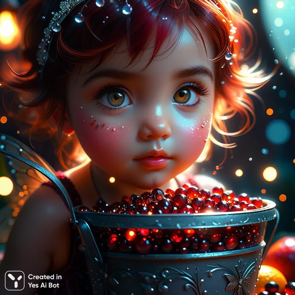 magical, star dust, fairytale. drawing, burgundy-red garnet, ripe cracking fruits, little baby fairy, fluffy curved eyelashes, contented, collects garnet seeds in a small silver bucket, glitter of dew drops, fireflies, glass, garnet seeds, splashes of juice