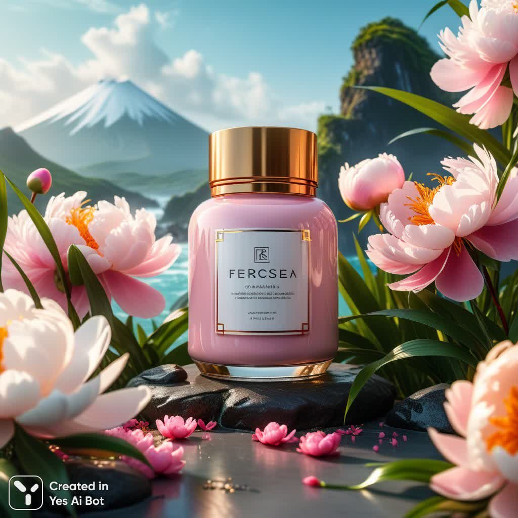 Изысканный снимок демонстрирует парящую банку нежного светло-розового оттенка, словно невесомое облако. Вокруг банки в танце застыли летящие бутоны пионов, изящная тигровая трава, стебли сахарного тростника, вулканический пепел и морская иловая порода – символы природной щедрости и землистых богатств. Под этой завораживающей композицией располагается лаконичный текст: 'Кремы для лица с мускатной пудрой и молочной инвазией', намекающий на инновационную формулу продукта, сочетающую в себе традиции и передовые технологии. Фон выполнен в чистейшем белом цвете, подчеркивая чистоту ингредиентов и элегантность дизайна. Вся сцена пронизана духом простоты и минимализма, создавая ощущение утонченной роскоши и гармонии с природой. Кажется, будто застывший во времени момент передает суть обновления и преображения, вдохновляя на поиски красоты и совершенства. Использование натуральных элементов в сочетании с технологическими нотками намекает на создание продукта, который не только дарит ощущение роскоши, но и заботится о здоровье кожи, пробуждая чувство роста, процветания и инновационного подхода к красоте. Это визуальная ода современному люксу, вдохновленному природой и созданный для тех, кто ценит гармонию и безупречность в каждой детали