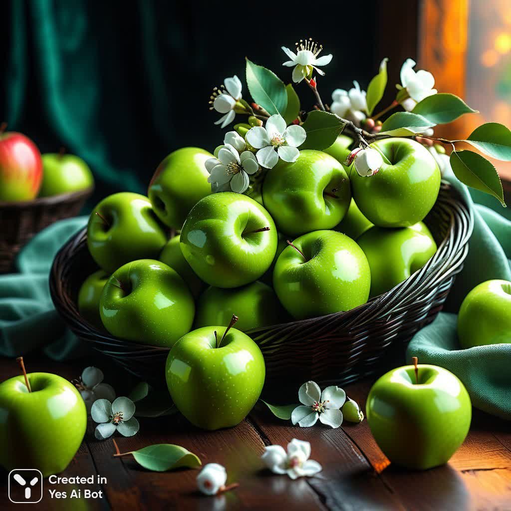 Изображение представляет собой захватывающий дух пейзаж, полностью заполненный великолепием зеленых яблок. Плотное скопление фруктов создает ощущение изобилия и свежести, погружая зрителя в атмосферу уюта и благополучия. Мягкие хлопковые коробочки, словно снежинки, нежно рассыпаны среди сочных яблок, добавляя композиции легкости и воздушности. Нежные цветки яблони деликатно дополняют картину, переплетаясь с плодами и ватой в гармоничном танце текстур и оттенков. Этот симбиоз природы создает ощущение сладкой неги и пробуждает аппетит к свежим фруктам и солнечному теплу. Изображение дышит жизнью и энергией, словно запечатленный момент сбора урожая в цветущем саду. Яркий фон, состоящий из зелени яблок, цветков и хлопка, создает ощущение бесконечного пространства и изобилия. Кажется, что можно ощутить аромат спелых яблок и легкое прикосновение пуха к коже. Общее впечатление от изображения – это воплощение гармонии, красоты и щедрости природы. Яркие цвета и богатые детали создают неповторимую атмосферу умиротворения и радости, побуждая наслаждаться простыми вещами и ценить красоту окружающего мира. Это визуальный гимн плодородию и изобилию, наполненный свежестью и оптимизмом