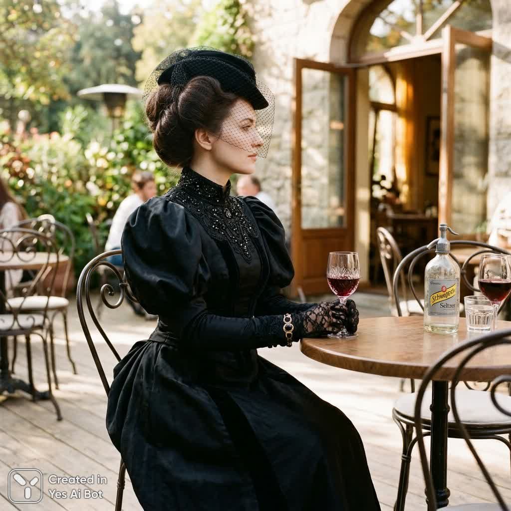 Изысканная картина запечатлевает момент созерцания молодой женщины в атмосфере викторианской элегантности и легкой меланхолии. В центре внимания – белокожая женщина около тридцати лет, сидящая за столиком уютного кафе. Её образ погружает зрителя в эпоху прошлую благодаря роскошному черному вечернему платью в стиле Виктории, ниспадающему до пола с пышными рукавами и высоким воротником, украшенным ажурной отделкой. Темные волосы собраны в сложную высокую прическу, а изящное черное покрывало частично скрывает лицо, придавая выражению спокойствия и утонченности. Её руки, украшенные браслетом, держат бокал красного вина, словно она предается неспешным раздумьям. Положение женщины слегка смещено влево от центра композиции, её тело повернуто под углом три четверти к зрителю, взгляд направлен вправо, устремленный вдаль. Задний план оживлён детализацией: светлый деревянный пол кафе, кованые стулья и столы создают атмосферу тепла и гостеприимства. Через открытую дверь видны отблески пышной зелени, добавляя глубину и живость пейзажу. На столе рядом с ней стоит два напитка и бутылка газированной воды, намекая на компанию или ожидание. Мягкий солнечный свет проникает внутрь, создавая причудливые тени, подчеркивающие текстуру платья и окружающего пространства. Общий тон картины – спокойный и умиротворенный, с едва заметным оттенком скуки, словно женщина застыла в мгновении тишины, наслаждаясь одиночеством и красотой момента. Ракурс камеры на уровне глаз позволяет зрителю почувствовать себя участником этой сцены, разделяя её спокойствие и задумчивость. Картина излучает атмосферу вневременной элегантности и утонченного созерцания