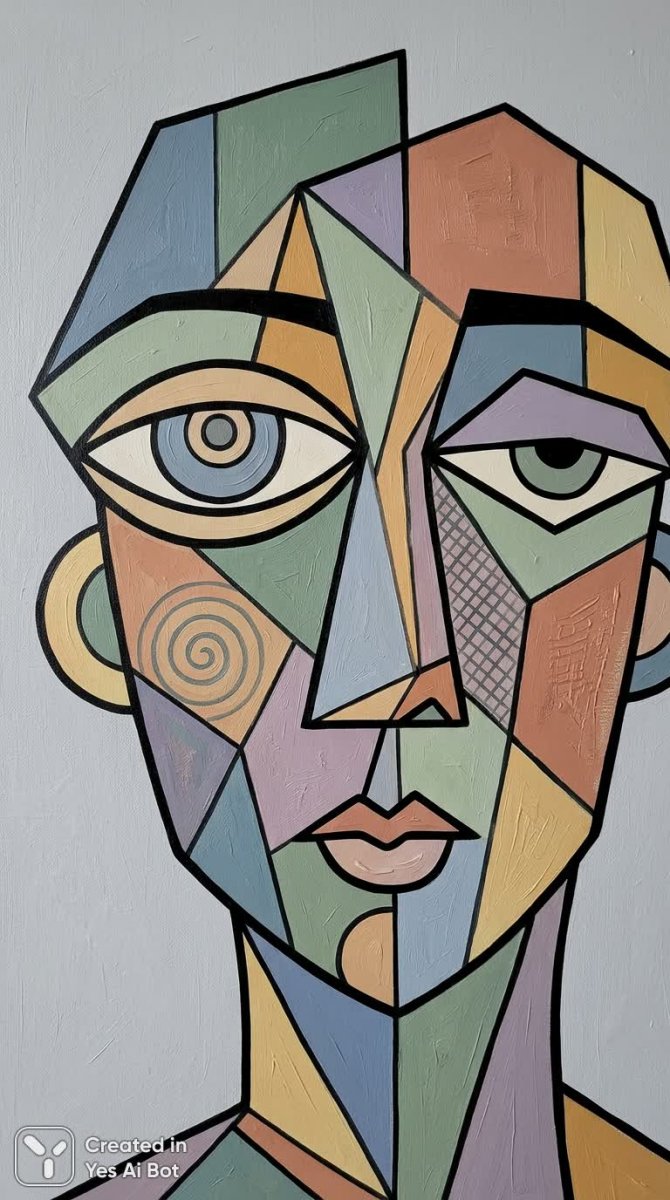 На изображении представлен абстрактный портрет, выполненный в стиле кубизма с использованием нейросети Nano Banana v.2.0. Лицо деконструировано на множество разноцветных геометрических форм, чётко очерченных чёрными линиями, создавая динамичный и фрагментированный эффект. В композиции присутствуют спирали и графические узоры, добавляющие визуальную сложность. Ключевыми элементами являются стилизованные большие глаза и схематичные губы, выделенные на фоне пастельно-серого цвета. Текстура холста имитирует масляную живопись, придавая изображению глубину и ощущение ручной работы. Минималистичная композиция акцентирует внимание на деталях лица, представляя собой пример современного искусства, исследующего восприятие формы и сочетающего абстракцию с узнаваемостью. Работа демонстрирует смелое использование цвета и геометрических элементов для создания уникального визуального образа, который вызывает размышления о природе человеческого лица в искусстве.