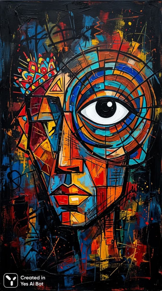 Яркая абстрактная картина лица завораживает своей динамикой и контрастом. Преобладающий черный фон служит идеальным холстом для буйства красок – насыщенного синего, алого, оранжевого и солнечного желтого. В центре композиции выделяется взгляд: огромный глаз с черным зрачком и белоснежной радужкой окружен причудливым узором из голубых и оранжевых полос, создавая ощущение глубины и загадочности. На левой стороне головы красуется небольшой головной убор, украшенный красными и желтыми полосками, добавляющий образу игривости и эксцентричности. Стиль картины отсылает к кубизму и лоскутному шитью, сочетая в себе геометрические формы и фрагментарность изображения. В работе прослеживаются элементы индустриального арт-минимализма – лаконичность форм, акцент на текстуре и выразительность цвета. Картина словно рассказывает историю о силе взгляда, о многогранности личности и о красоте абстрактного выражения. Она приглашает зрителя к размышлению, позволяя каждому увидеть в ней свой собственный смысл и интерпретацию. Это произведение искусства – настоящий гимн цвету и форме, воплощение креативности и оригинальности, которое способно украсить любое пространство и подарить его владельцу ощущение уюта и вдохновения. Картина станет отличным акцентом для современного интерьера или ценным подарком для ценителя нестандартного искусства