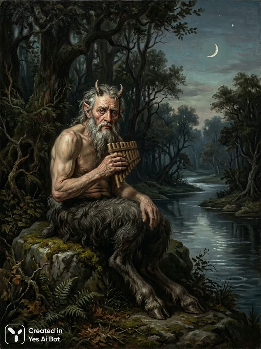 В центре композиции запечатлен старый сатир с бледной кожей и седеющей бородой и волосами его взгляд пронзителен а выражение лица немного печально. Он облачен в темную лохматую шкуру, которая скрывает нижнюю часть тела, в то время как верхняя остается открытой демонстрируя мускулистые руки. В левой руке сатир держит набор флейт готовый извлечь из них мелодию своими пальцами. Фигура расположена на левом краю переднего плана повернута к зрителю в три четверти, слегка наклонена вправо. Задний план представляет собой мрачный лесной пейзаж деревья с темной листвой создают фон а в верхнем правом углу неба видна часть серпа луны отбрасывающая тусклый неземной свет. В центре кадра можно увидеть водную гладь, возможно реку или озеро отражающую сумеречное небо. Цветовая палитра приглушена и землистая преобладают зеленые коричневые и серые оттенки перемежающиеся с бледно-желтым лунным сиянием. Мягкое атмосферное освещение создает мистическую и меланхоличную атмосферу. Ракурс находится на уровне глаз погружая зрителя в уединенный мир сатира. Стиль напоминает классическую живопись маслом с четкими мазками и богатой текстурой, создавая ощущение глубины и реализма. Эта картина словно окно в другой мир наполненное тайнами и печалью древнего существа