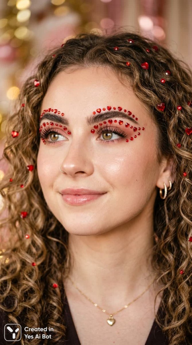 A close-up portrait of a young woman with fair skin and striking hazel eyes, gazing slightly upward. Her eye makeup features long, curled black eyelashes, subtle pink eyeshadow, and well-defined eyebrows. Red, heart-shaped and round rhinestones are meticulously arranged above her eyebrows, along her eyelids and surrounding her eye, creating a decorative, glamorous look. Her curly, light brown hair is adorned with matching red rhinestones scattered throughout, framing her face seamlessly. The skin appears flawless with a soft, luminous glow, emphasizing the smooth texture and gentle highlights on her cheekbone and brow bone. The lighting is wa...