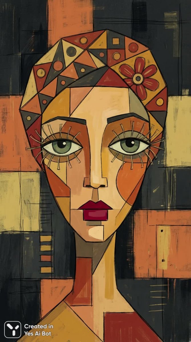 Яркая абстрактная картина, изображающая женское лицо, представляет собой захватывающее сочетание эмоций и форм. Преобладающий черный фон служит контрастным полотном для буйства красок: алого, оранжевого и желтого цветов, создающих ощущение тепла и энергии. В центре композиции – большие выразительные зеленые глаза с длинными ресницами, которые приковывают взгляд своей глубиной и загадочностью. Маленький рот подчеркнут смелым красным цветом губ добавляет образу чувственности и легкой провокационности. На голове у изображенной женщины – изысканный головной убор, украшенный красным цветком и полосатым узором, придающим облику экзотическую нотку и подчеркивающим индивидуальность. Картина насыщена геометрическими формами и линиями, создающими динамичную структуру и визуальный интерес. Стиль работы выполнен в духе кубизма с элементами лоскутной стилизации, что придает произведению современный и авангардный вид. В целом картина сочетает черты индустриального искусства, абстрактного минимализма и экспрессионистской живописи, создавая уникальное произведение, которое вызывает широкий спектр эмоций и впечатлений. Это не просто портрет, это исследование человеческой души через призму цвета, формы и композиции. Работа обладает сильной визуальной привлекательностью и способна стать ярким акцентом в любом интерьере, вдохновляя на размышления о красоте, искусстве и самовыражении. Картина передает ощущение внутренней силы и уверенности, несмотря на абстрактную форму