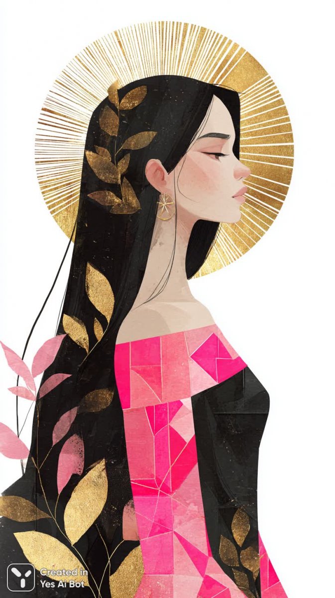 Изысканный портрет молодой женщины, выполненный в стилистике минимализма и графики. В центре внимания – ее спина и профиль, обрамленные длинными, струящимися черными волосами с яркими акцентами розового и золотого цветов. Пряди волос украшены тонкими золотыми листьями, создающими ощущение легкости и воздушности. На модели элегантное платье без бретелек черного цвета, рукава которого выполнены из коротких геометрических вставок насыщенного розового оттенка, добавляющих динамики в образ. Шея изящно подчеркнута, а все композиция пронизана чувством утонченности и элегантности. Фоном служит графическое пространство с яркими лучами черного, белого, золотого цветов, создающими эффект сияния и глубины. За головой модели едва заметен золотой нимб, придающий образу мистическую ауру и завершающий композицию. Вся работа выполнена в глянцевой технике с чистыми линиями, что подчеркивает ее высокое качество и современный стиль. Это произведение искусства – воплощение красоты, грации и минимализма, способное захватить взгляд своей гармонией и элегантностью. Использование контрастных цветов и геометрических форм создает визуальный интерес и добавляет динамики статичному изображению. Портрет излучает уверенность и спокойствие, демонстрируя идеальное сочетание классической эстетики и современных тенденций в искусстве