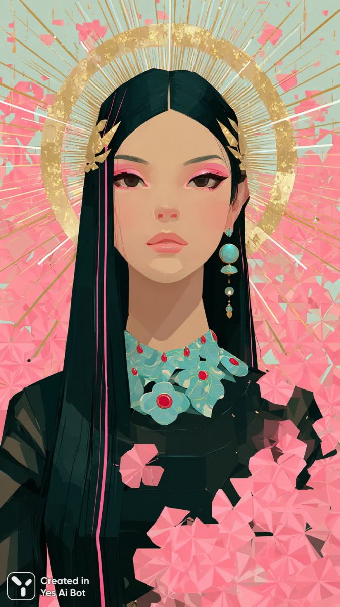 Изысканный портрет юной азиатской женщины, воплощающий в себе гармоничное сочетание традиционной красоты и современного артистизма. Длинные черные волосы, украшенные нежными розовыми и золотыми прядями, словно струятся волнами, а золотые листья добавляют образу утонченности и роскоши. Элегантное платье цвета ночи с открытыми плечами подчеркивает изящный силуэт, а короткие рукава придают легкости всему ансамблю. Массивная бижутерия – яркий ожерелье и серьги насыщенных оттенков бирюзы и красного – акцентирует внимание на выразительных чертах лица. Безупречная фарфоровая кожа сияет в лучах света, а яркий макияж с розовыми тенями для век и алыми губами придает портрету особую живость и привлекательность. Фоном служит золотистое свечение, напоминающее нимб, из которого исходят черно-белые лучи и геометрические розовые цветы, создавая ощущение неземной красоты. Вся композиция пронизана духом ар-деко и поп-арта, что проявляется в смелых цветовых решениях и динамичном сочетании различных стилистических элементов. Насыщенные, яркие цвета визуально усиливают эффект присутствия, а высочайшая детализация цифровой живописи позволяет рассмотреть каждую мелочь, создавая впечатление реалистичности и глубины. Это произведение искусства – ода женственности, красоте и креативному видению мира, где традиции переплетаются с современными тенденциями, рождая неповторимый образ. Взгляд зрителя невольно приковывается к этой завораживающей картине, наполненной энергией и вдохновением