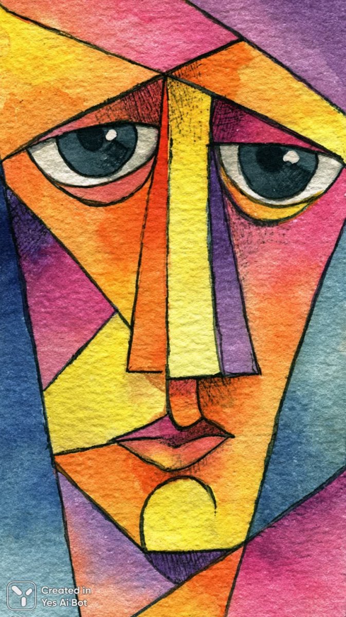 Яркое абстрактное полотно представляет собой стилизованное изображение лица, собранное из разноцветных лоскутов оранжевого, желтого, розового, фиолетового и голубого цветов. Композиция построена на контрасте форм: четкие геометрические фигуры соседствуют с мягкими изгибами, создавая динамичный визуальный эффект. В центре внимания – большие черные глаза, устремлённые прямо на зрителя, придающие портрету ощущение загадочности и вовлечённости. Рот слегка приоткрыт, словно готов произнести слово, усиливая ощущение живости и присутствия. Фон выполнен в насыщенном зелёном цвете и акцентирован смелыми линиями, формирующими геометрический узор из треугольников и линий вокруг глаз, что добавляет изображению глубины и сложности. Влияние стилизации и кубизма очевидно в деконструкции формы лица и её переосмыслении через призму абстрактных форм. Работа выполнена в духе индустриального искусства, сочетая в себе элементы абстрактной живописи, стилизации и минимализма. Преобладание геометрических фигур с плавными контурами, насыщенная цветовая палитра и отсылки к кубизму создают гармоничное сочетание, которое привлекает внимание своей оригинальностью и выразительностью. Этот шедевр – пример современного художественного языка, где форма и цвет сливаются воедино, чтобы передать эмоциональное состояние и запечатлеть мимолётное впечатление от увиденного. Полотно излучает энергию и динамизм, демонстрируя мастерство художника в создании уникального произведения искусства, способного пробудить воображение и вызвать глубокий эстетический отклик у зрителя. Это яркое свидетельство творческого поиска и экспериментов на стыке различных художественных направлений