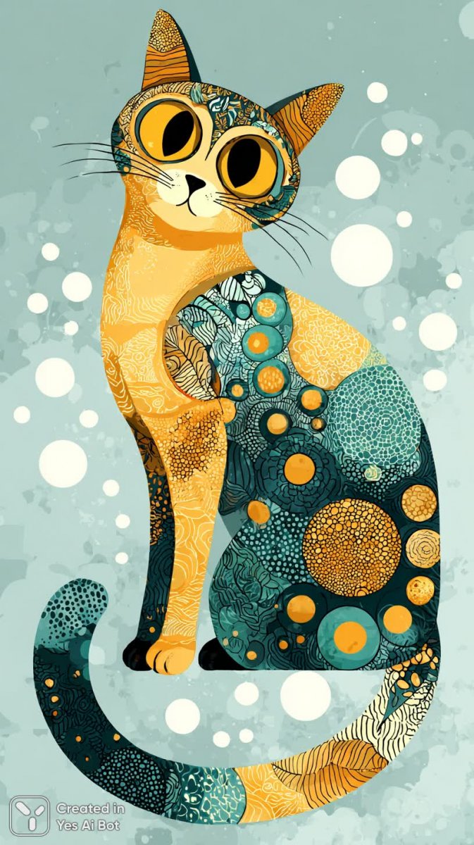 Яркий и жизнерадостный рисунок изображает кота насыщенного желтого цвета, чья внешность полна очарования и игривости. Большие, выразительные глаза притягивают внимание, а необычный узор из зеленых и синих кружков, напоминающих пятна, добавляет ему уникальности. Хвост кота украшен пестрыми полосами, создавая эффектный акцент в общей композиции. Поза животного передает его игривый характер – он грациозно вытягивается, словно готовясь к прыжку или забаве. Шерсть кота покрыта декоративными узорами, выполненными с тщательной детализацией, что подчеркивает его особенный стиль и добавляет визуальный интерес. Фоном для этого милого создания служит однотонный светло-голубой фон, украшенный белыми кругами, которые создают ощущение легкости и воздушности. Использование плоского дизайна и контурной графики придает изображению современный вид. Вся картина выполнена в ярких, насыщенных цветах и оформлена в стиле doodle с элементами орнамента, что делает ее особенно привлекательной и запоминающейся. Выражение мордочки кота передает его радостное настроение, создавая позитивное впечатление у зрителя. Это настоящий шедевр мультяшного искусства, полный энергии и позитива