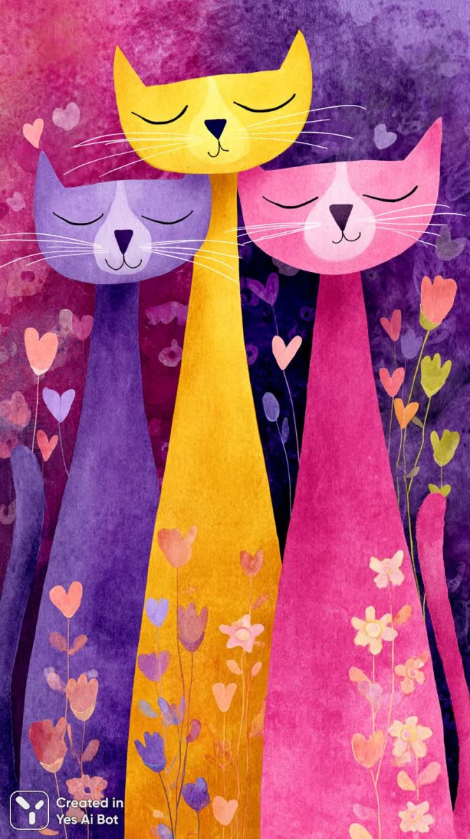 Три очаровательные мультяшные кошки стоят бок о бок, излучая радость и безмятежность. Каждая из них обладает своим уникальным цветом: одна – нежно-фиолетовая, вторая – жизнерадостная желтая, а третья – игриво-розовая. Их глазки прикрыты в блаженной улыбке, словно они наслаждаются теплым летним днем. Тельца кошек украшены изящными аппликациями в виде цветов и узоров, создавая впечатление сказочного наряда. В воздухе порхают разноцветные бабочки и парят забавные сердечки, добавляя композиции легкости и романтики. Фоном для этой милой сцены служит залитая солнцем цветочная поляна, усыпанная яркими цветами всех оттенков радуги. Белый фон подчеркивает чистоту и свежесть изображения, а чистый дизайн с плавными линиями создает ощущение легкости и воздушности. Общий стиль картины – веселый, яркий и декоративный, выполненный с использованием мягких линий и насыщенных цветов. Все элементы композиции гармонично сочетаются друг с другом, создавая позитивное и жизнерадостное настроение, которое не может не вызвать улыбку. Это настоящее произведение искусства, наполненное теплом, любовью и детской непосредственностью, идеально подходящее для оформления детских товаров или создания милых иллюстраций