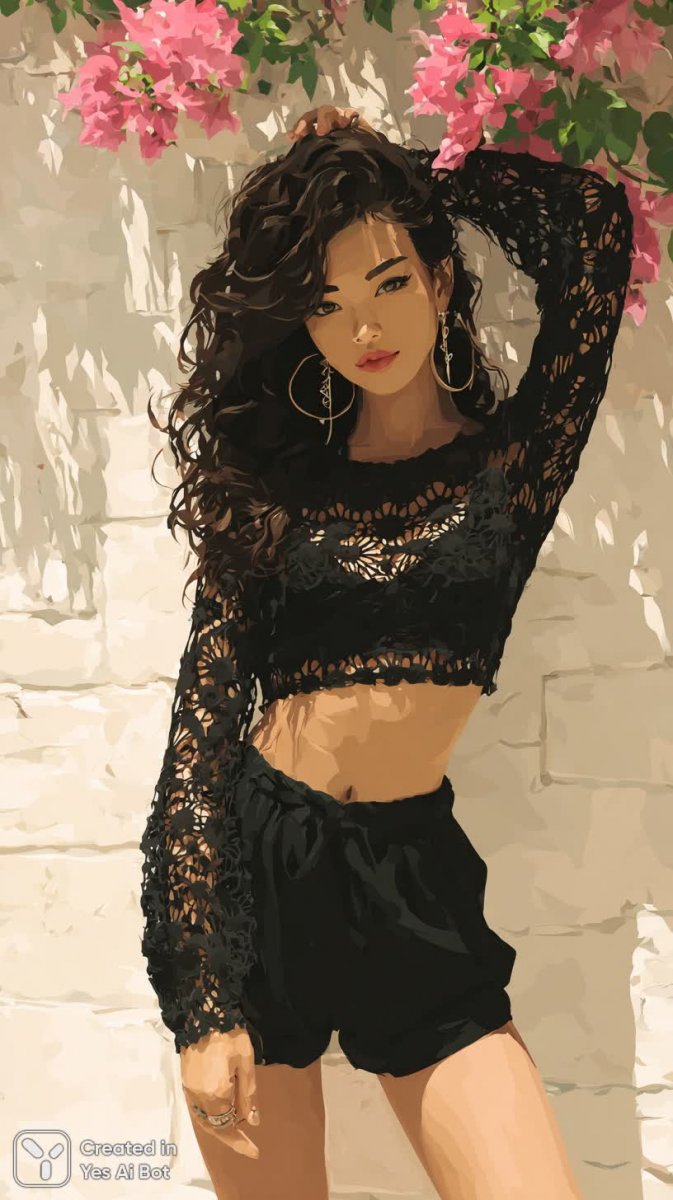 Изящный летний образ молодой женщины, воплощающий богемный шик и непринужденную уверенность. Длинные волнистые темные волосы ниспадают на плечи, обрамляя лицо, подчеркнутое выразительный макияж. Черный вязаный топ из толстой пряжи гармонично сочетается с высокими шортами сложного ажурного узора, создавая легкий и воздушный силуэт. Под летней одеждой скрывается черный бикини, добавляющий образу пикантности. Акцент на деталях – крупные кольца в ушах и стильные большие солнцезащитные очки, завершающие образ. Запотевшая от солнца кожа свидетельствует о беззаботных днях, проведенных на свежем воздухе. Мягкое рассеянное освещение подчеркивает естественную красоту модели и создает атмосферу тепла и уюта. Фон представляет собой залитый солнцем летний дворик с буйством розовых цветов и белоснежной стеной, усиливая ощущение легкости и свободы. Поза расслабленная, но уверенная – рука придерживает бедро, демонстрируя непринужденность и внутреннюю силу. Это идеальный кадр для модной фотосессии, запечатлевший момент безмятежного счастья и стиля. Композиция продумана до мелочей, создавая гармоничный баланс между деталями одежды, природным фоном и выражением лица модели. Образ излучает позитив, энергию и любовь к жизни, вдохновляя на новые свершения и подчеркивая индивидуальность каждой женщины. Все элементы фотографии работают вместе, чтобы создать незабываемое впечатление у зрителя, передавая атмосферу летнего беззаботного дня и богемного стиля