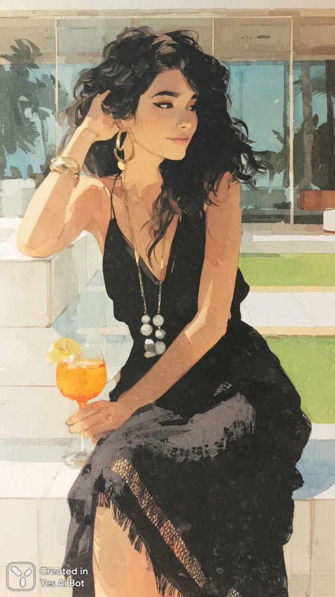 Изысканный летний образ, воплощающий собой сочетание роскоши и непринужденной элегантности. В центре внимания – женщина в эффектном черном платье-кафтан из кружевной сетки с оригинальным рыбным плетением, украшенном крупной сеткой и декоративными бисером. Под платьем скрывается стильный черный купальник, подчеркивающий безупречную фигуру. Акцент на декольте делают несколько золотых цепочек, добавляющих образу блеск и шик. Длинные волнистые волосы средней длины свободно ниспадают до плеч, создавая ощущение естественной красоты и легкости. Одна рука приподнята к голове в жесте непринужденной грации, а на белом столике рядом стоит освежающий оранжевый коктейль, намекающий на летнее настроение и безмятежный отдых. Фоном для этой живописной сцены служит современная терраса с белоснежной плиткой и изумрудным газоном – идеальное место для наслаждения солнечным днем. Яркий дневной свет подчеркивает детали одежды, аксессуаров и окружающей обстановки, создавая атмосферу роскошного летнего отдыха в стиле модной фотографии высокого качества. Этот образ идеально отражает современный стиль, сочетающий комфорт, элегантность и внимание к деталям. Он предназначен для тех, кто ценит качество, изысканность и стремится выглядеть безупречно в любой ситуации. Вся композиция дышит легкостью, летним настроением и утонченным вкусом