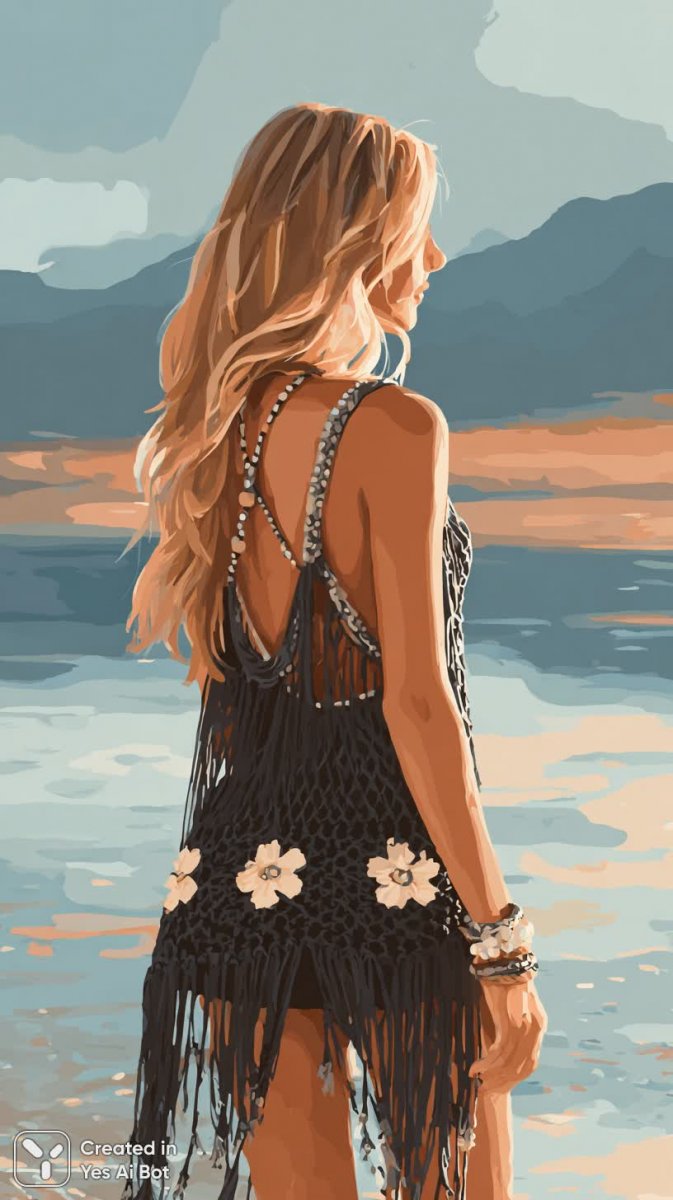 Изысканный портрет эффектной блондинки с длинными струящимися волосами, запечатленный на фоне живописного морского пейзажа в лучах заходящего солнца. В кадре – уверенная и соблазнительная женщина в черном блестящем бикини, дополненном полупрозрачным кружевным платьем из толстой черной веревки. Узор платья украшен нежными белыми цветочными деталями и декоративными кистями, создавая неповторимый акцент на женственности и грации. Платье имеет оригинальный крой с рукавами-клеш, подчеркивающими легкость и воздушность образа. Изящное ожерелье и несколько браслетов из белого металла дополняют стильный ансамбль, а руки, уверенно положенные на бедра, демонстрируют силу и независимость героини. Мягкий рассеянный свет подчеркивает гладкость кожи и придает снимку особую атмосферу загадочности и романтики. На заднем плане простирается бескрайнее море, сливающееся с линиями далеких гор, создавая ощущение безграничного простора и свободы. Фотосессия выполнена в стиле глэм-фотографии, отличающейся акцентом на элегантности, гламуре и роскоши. Высокое качество изображения (HD) позволяет рассмотреть каждую деталь – от переливов света на волосах до тончайших деталей кружевного платья. Вся композиция пронизана атмосферой стиля, утонченности и безупречного вкуса, превращая этот снимок в настоящее произведение искусства. Это фото - воплощение современной моды и женской красоты, идеально передающее атмосферу роскоши и безмятежности