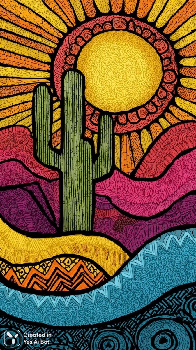 Яркая психоделическая мандала, вдохновленная кактусом, излучает энергию и трансцендентность. В центре композиции сияет солнце, украшенное замысловатыми орнаментами, словно отражая божественный свет. За солнцем простираются многослойные абстрактные холмы, создающие ощущение глубины и бесконечности пространства. Динамичные зигзаги и завораживающие спирали переплетаются друг с другом, формируя гипнотический узор, который притягивает взгляд и погружает в состояние медитации. Четкие, смелые черные контуры придают изображению графическую выразительность и структуру, а яркая неоновая палитра взрывается красками, создавая ощущение праздника и радости. Вся композиция выполнена в стиле doodle – спонтанном и непринужденном, что добавляет ей шарма и индивидуальности. Заметны элементы мексиканских народных мотивов, которые придают работе аутентичность и культурную глубину, отсылая к древним традициям и символам. Этот образ сочетает в себе мистику, энергию и красоту, являясь воплощением творческого вдохновения и визуального наслаждения. Он словно приглашает зрителя отправиться в путешествие по миру фантазий и ощутить гармонию с собой и окружающим пространством, погружаясь в безграничный мир ярких красок и узоров