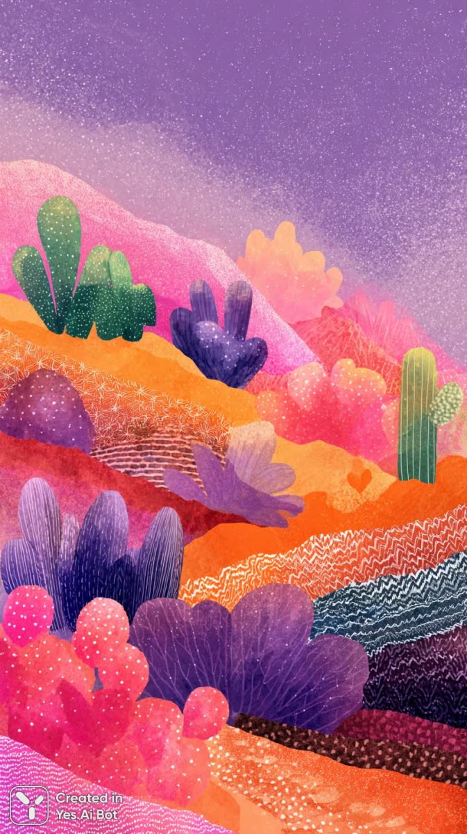 Яркий абстрактный пейзаж завораживает своей необычностью и энергией. В нем гармонично сочетаются элементы пустынного ландшафта – колючие кактусы и сочные суккуленты, слои земли с динамичными зигзагами, создающие ощущение движения и глубины. Геометрические этнические мотивы придают композиции особый колорит и загадочность, напоминая о древних культурах и традиционных узорах. В палитре преобладают насыщенные, сочные оттенки: огненно-оранжевый, нежно-розовый, глубокий пурпурный и свежий зеленый, которые создают яркий контраст и визуальную привлекательность. Эта декоративная картина словно оживает благодаря своей выразительности и необычному сочетанию цветов. Вся композиция пронизана сюрреалистической атмосферой, где реальность переплетается с фантазией, а привычные образы приобретают новые формы и значения. Зритель погружается в мир воображения, где каждый элемент имеет свой уникальный смысл и символизм. Картина вызывает ощущение радости, удивления и вдохновения, приглашая к размышлению о красоте окружающего мира и безграничных возможностях человеческого творчества. Она станет прекрасным украшением интерьера, добавив в него нотку оригинальности и загадочности. Эта работа – настоящий гимн цвету и форме, воплощение творческой энергии и вдохновения