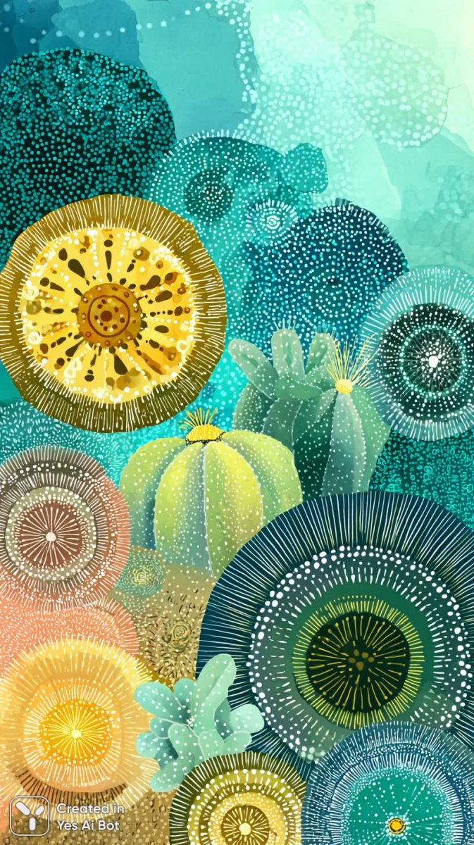 Яркая и необычная иллюстрация, представляющая собой стилизованное изображение кактусов на переднем плане. Центральным элементом композиции является концентричное солнце, выполненное в форме мандалы, что придает работе медитативный и гармоничный характер. Фон украшен сложным узором из точек и линий, создающим ощущение глубины и динамики. Вся картина пронизана психоделическими мотивами, выраженными через причудливые орнаменты и яркие цвета. Ручная обводка контуров придает работе особый шарм и подчеркивает ее авторский стиль. Общая атмосфера произведения наполнена игривостью и мультяшностью, создавая позитивное и радостное настроение. Использование карикатурных элементов добавляет легкости и непринужденности, делая картину привлекательной для широкой аудитории. Стиль исполнения напоминает наивное искусство, с его простотой форм и яркими красками. Композиция выдержана в духе современной графики, сочетающей элементы различных направлений, от этники до абстракционизма. В целом, иллюстрация производит впечатление творческого эксперимента, наполненного позитивной энергией и оригинальными идеями. Она может быть использована для оформления различных дизайнерских проектов, а также послужить источником вдохновения для художников и дизайнеров. Картина излучает оптимизм и приглашает зрителя в мир фантазии и воображения