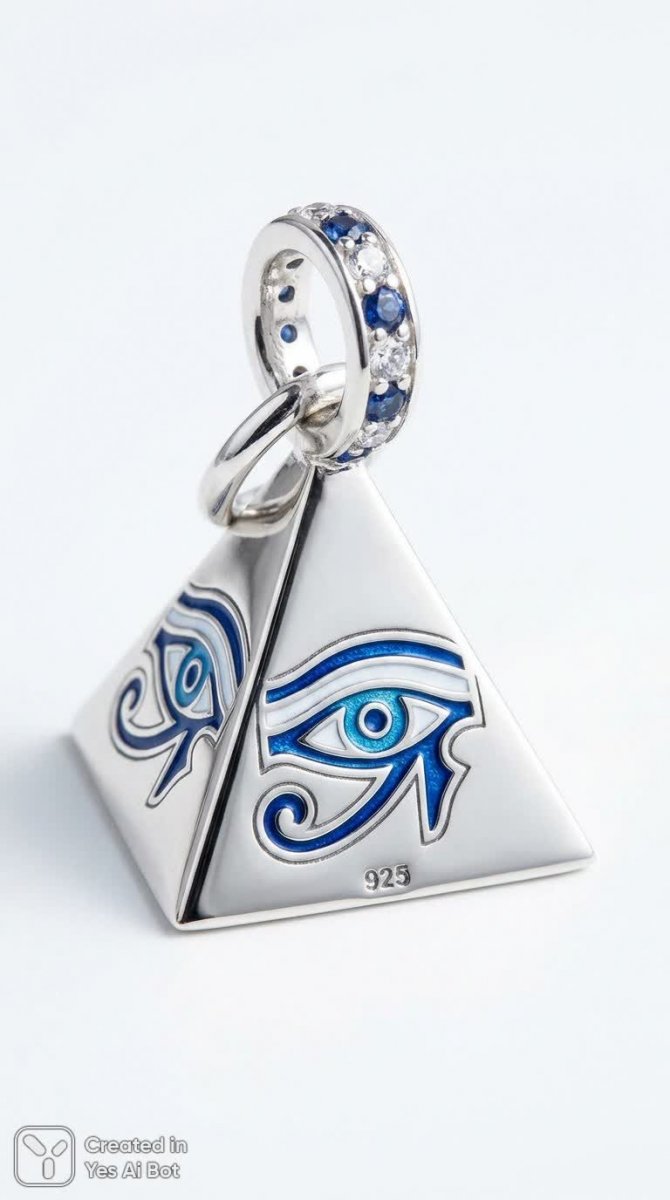 pyramid charm pendant, each face engraved with stylized eye inlaid with blue and white enamel, top ring studded with alternating blue and clear stones, engraved "925" on base, clean white BG, macro capture, high contrast lighting, minimalist product shot image: angled macro shot showing three faces of pyramid, precise gemstone inlay and polished edges, subtle shadowing for depth
