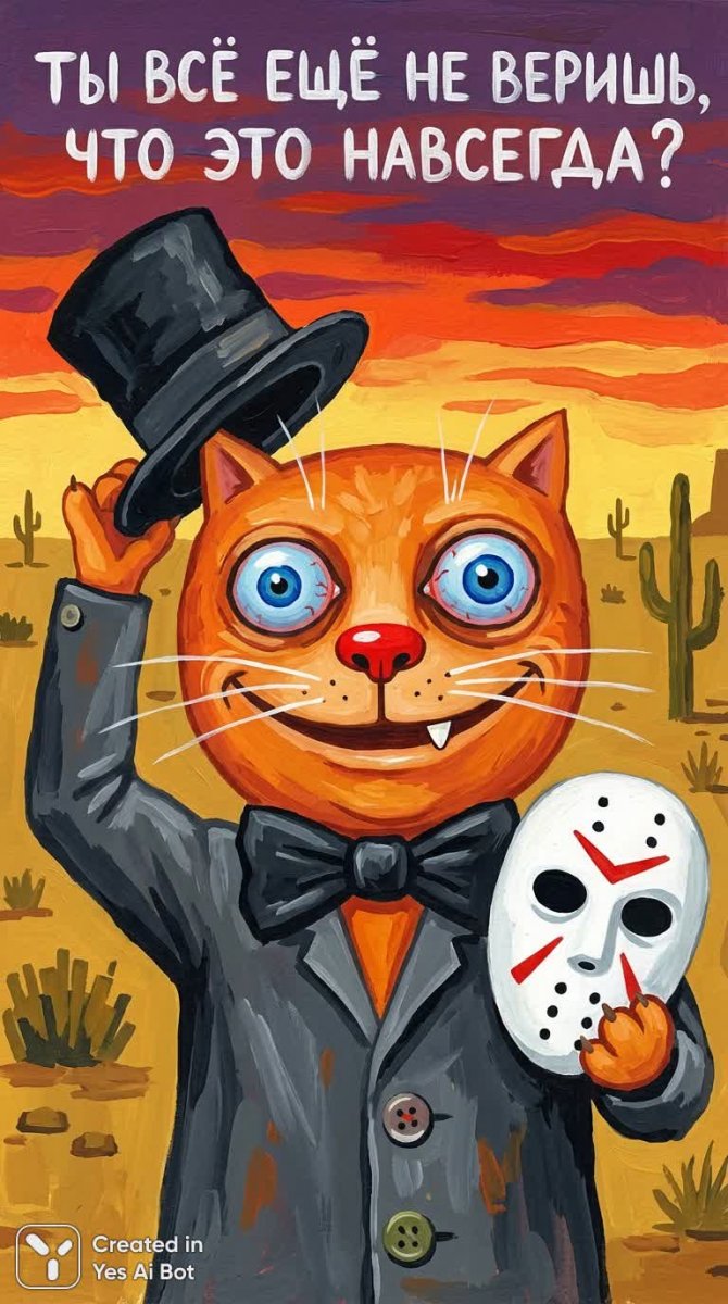 Завораживающий акриловый постер в наивной сюрреалистичной манере представляет собой яркий образ оранжевого антропоморфного кота – эксцентричного волшебника, чье лицо занимает почти все пространство. Его непропорционально большая голова с выпуклыми голубыми глазами и широкая улыбка, демонстрирующая единственный зуб, создают одновременно комичный и слегка жуткий эффект. Длинные тонкие белые усы, маленькие треугольные ушки и красный округлый нос добавляют персонажу причудливого очарования. Кот одет в темный серый полосатый пиджак с крупными пуговицами и огромным черным бабочкой. Левая лапа грациозно поднимает черную цилиндрическую шляпу, а правая держит белый хоккейный шлем с черными глазницами и красными зигзагообразными узорами – символ скрытой идентичности или тайны. Искаженная перспектива подчеркивает гротескность сцены, а центральная композиция фокусирует внимание на главном герое. Фоном служит теплый желто-коричневый пустынный пейзаж с редкими деревьями и стилизованным закатным небом. Грубые мазки кисти и текстура гуаши придают изображению ощущение детской наивности, а общий стиль напоминает примитивное народное искусство. Сочетание слегка жуткого юмора и эстетики винтажного мема создает уникальную атмосферу загадочности и абсурда. Насыщенные цвета и высокий контраст усиливают визуальное воздействие. В верхней части плаката расположена белая русская рукописная надпись: 'ты все еще не веришь, что это навсегда?'. Эта фраза добавляет философский подтекст к изображению странного кота-волшебника, предлагающего маску – символ переменчивости и иллюзорности реальности. Постер представляет собой причудливую комбинацию фольклорного искусства, сюрреалистических мотивов и современного юмора, приглашая зрителя задуматься о природе веры и бесконечности