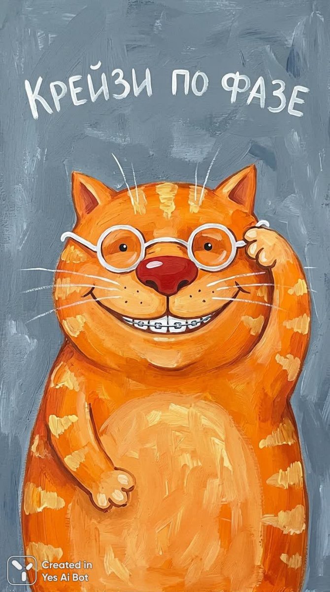 Забавный и наивный рисунок демонстрирует очаровательного оранжевого кота с выражением беззаботной радости на мордочке. Кот изображён в анфас, его округлое тельце и пушистая шерсть яркого оранжевого цвета с нежными жёлтыми полосками создают ощущение мягкости и уюта. Особенностью изображения являются большие очки в белой оправе и улыбка, украшенная брекетами – такие детали придают коту неповторимый комичный шарм и делают его образ ещё более запоминающимся. Маленький красный носик и треугольные ушки добавляют милоты этому персонажу. Тонкие белые усики элегантно обрамляют мордочку, а лапка, держащая оправу очков, подчёркивает игривость момента. Иллюстрация выполнена в стиле детского рисунка с использованием акриловой живописи и текстурных мазков кисти, что создаёт ощущение объёмности и тактильности. Фон выполнен в серых и голубых тонах, добавляя общей композиции спокойствия и гармонии. Вся картина пронизана духом простоты, причудливости и ярких цветов, характерных для наивного искусства. Расположение объекта в центре кадра делает его фокусом внимания, а надпись на русском языке крейзи по фазе добавляет изображению оригинальности и лёгкости, передавая настроение беззаботности и позитива. Этот рисунок – настоящий источник хорошего настроения и радости для зрителя любого возраста. Он излучает теплоту, юмор и дружелюбие, заставляя улыбаться и видеть мир в ярких красках