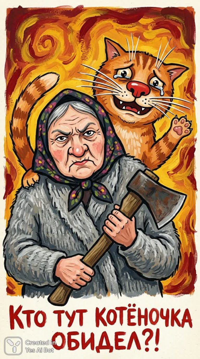 Яркая и экспрессивная иллюстрация в наивном стиле с элементами примитивизма представляет собой хаотичный коллаж из запоминающихся деталей. В центре композиции – грозная бабушка в сером платке, уверенно смотрящая на зрителя с выражением недовольства. Ее черты лица нарочито преувеличены, подчеркивая характерный образ. За ее спиной разворачивается драматическая сцена: рыжий кот, исполненный отчаяния, издает душераздирающий вопль огромными влажными глазами и одновременно ухмыляется с иронией. Его большой красный нос и длинные белые усы добавляют комичности ситуации, а поднятая лапа выражает некую мольбу о прощении или жалость. Изображение выполнено в технике плоской живописи с насыщенными цветами и отчетливо видимыми мазками кисти. Теплый желто-красный фон создает ощущение динамики и хаоса, закручиваясь вихрем вокруг центральных персонажей. Композиция выстроена как постер – лаконичная и запоминающаяся. В нижней части изображения крупным красным рукописным кириллическим шрифтом размещена надпись: 'кто тут котеночка обидел?!', выполненная в стиле ручной росписи, что усиливает ощущение народности и непосредственности. Вся картина пронизана легкой жутковатой юмористической атмосферой, а также нотками сатиры, характерными для народного творчества. Она представляет собой яркую сцену, написанную гуашью или акрилом, с изображением бабушки и громкого рыжего кота на фоне динамичного теплого фона и смелой красной кириллической подписью, которая добавляет повествованию дополнительный слой смысла и интриги. Иллюстрация вызывает улыбку и заставляет задуматься о тонкой грани между серьезностью и абсурдом