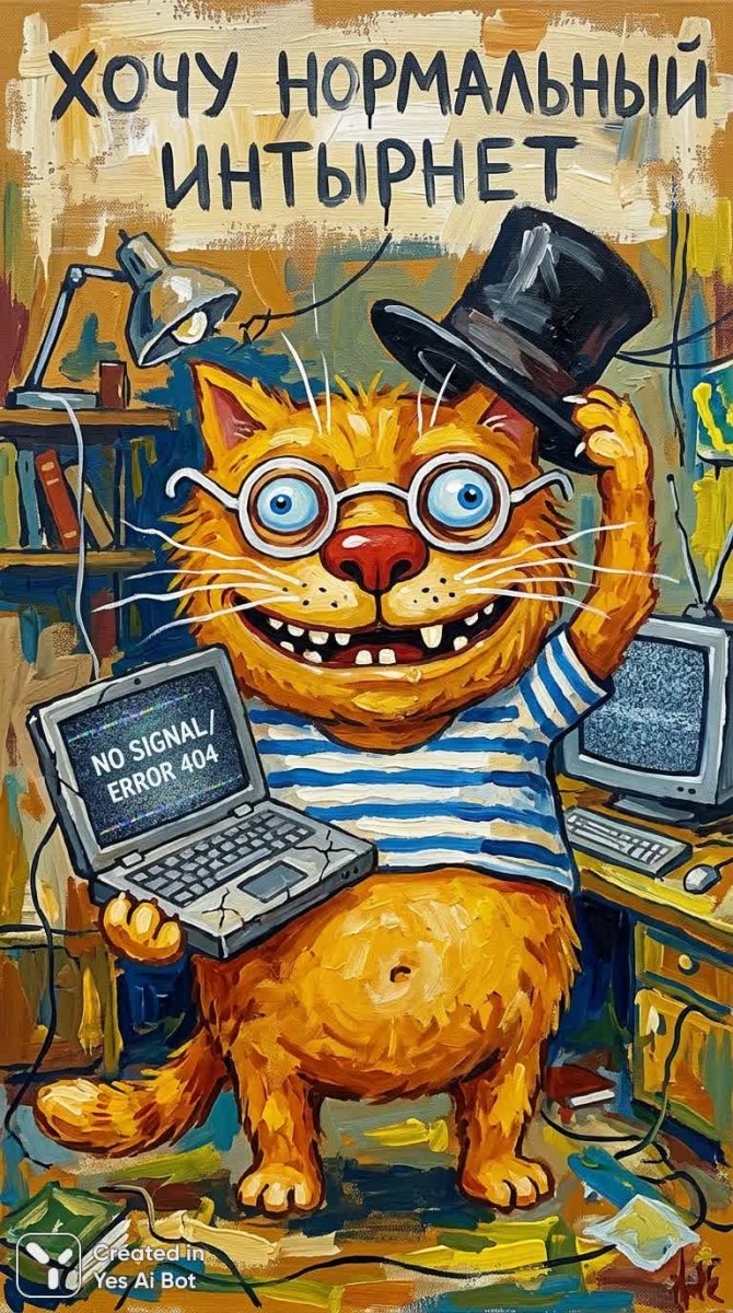 Этот яркий акриловый рисунок представляет собой хаотичную и антропоморфную иллюстрацию оранжевого кота. Портрет выполнен с фронтальным видом, где кот изображен с непропорционально большой головой и округлым, пухлым телом. Его шерсть имеет насыщенный оранжево-желтый цвет, украшенный тонкими белыми усиками и большим красным носом. Широкая, зубастая улыбка с одним виднеющимся зубом придает изображению комичный оттенок. В одной лапе кот держит потрескавшийся старинный ноутбук, а в другой – поднимает черную цилиндрическую шляпу. Его большие, выпученные голубые глаза выражают ироничное выражение, подчеркнутое круглыми белыми очками, надевленными набок. Видны текстурные мазки кисти, создающие ощущение ручной росписи по холсту. Цветовая палитра состоит из насыщенных, плоских цветов, с преобладанием теплых охристых и мягких голубых тонов. Композиция выдержана в центре, создавая эффект плаката. В верхней части изображения присутствует рукописный русский текст: 'Хочу нармальный интырнет', что добавляет произведению нотку примитивизма и отсылает к эстетике винтажных интернет-мемов. Общий стиль рисунка напоминает гуашь, с видимой грубой работой кисти, создающей ощущение наивности и непосредственности. В целом, иллюстрация передает слегка жутковатое, но юмористическое настроение