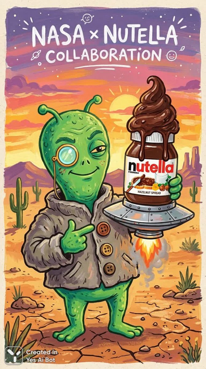Невероятно причудливая и забавная иллюстрация в стиле мема, выполненная от руки, представляет собой сюрреалистическое сочетание космических исследований и кулинарного удовольствия. В центре композиции – антропоморфный зеленый инопланетянин, облаченный в серый полосатый пиджак с крупными пуговицами, элегантно демонстрирующий свое изобретение: ракету, работающую на Нутелле. Ракета установлена на летающей тарелке, а ее носовая часть вылеплена в форме аппетитного шоколадного завитка. Заглянув внутрь, можно увидеть текущую шоколадную пасту – топливо для этого необычного космического аппарата. Инопланетянин, с серьезным видом и моноклем над левым глазом, указывает левой лапой на зрителя, а правой уверенно держит свой шедевр. Фон изображает теплый пустынный пейзаж с стилизованным закатным небом, создавая атмосферу мечтательности и безграничного воображения. Иллюстрация выполнена в наивной манере мультяжного рисунка с использованием гуаши, что придает ей текстурность и ощущение ручной работы. Простые формы и яркие, насыщенные цвета подчеркивают нарочитость простоты и добавляют шарма. В верхней части изображения расположен белый рукописный двуязычный текст: 'NASA Nutella Collaboration', который усиливает комический эффект и намекает на вымышленное сотрудничество между космическим агентством и производителем шоколадной пасты. Общий стиль работы напоминает лоуброу фолк-арт, характеризующийся нарочитой грубостью мазков и простотой исполнения, создавая уникальный визуальный опыт. Это яркое и запоминающееся произведение искусства, сочетающее в себе юмор, абсурд и детскую непосредственность
