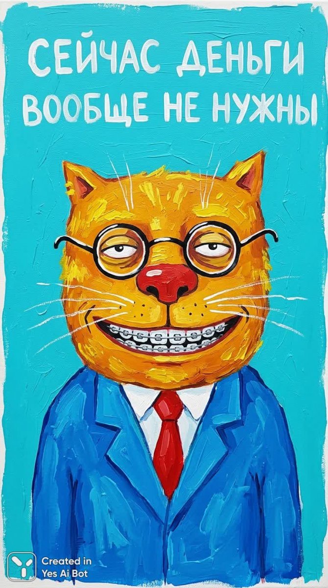 Яркий ироничный постер в наивном экспрессионистском стиле представляет собой забавного антропоморфного кота цвета апельсина. Это портрет наполовину тела с акцентом на непропорционально большую голову, покрытую оранжево-желтой шерстью с желтыми полосками. Маленькие треугольные уши и выпученные глаза с саркастическим выражением лица придают персонажу особое очарование. Длинные белые усы и большой красный нос дополняют его комичный образ. Широкая улыбка, украшенная брекетами, а также круглые белые очки усиливают впечатление абсурдности и легкости. Кот одет в строгий синий пиджак от костюма и белую рубашку с красным галстуком, что создает контраст между его несерьезным видом и деловым антуражем. Фон выполнен в виде однородного ярко-бирюзового цвета, а нарочито грубые мазки кистью и насыщенные плоские цвета подчеркивают художественную простоту и примитивность изображения. Над котом нарисован белым шрифтом русский текст: В наши дни вам абсолютно нет нужды в деньгах, что добавляет тексту дополнительный слой юмора и сатиры. Вся композиция создает атмосферу игривости и легкого абсурда, демонстрируя смелое сочетание наивного стиля с социальной критикой и визуальной экспрессией. Постер излучает позитивную энергию и предлагает зрителю задуматься над современными ценностями и приоритетами в юмористической форме