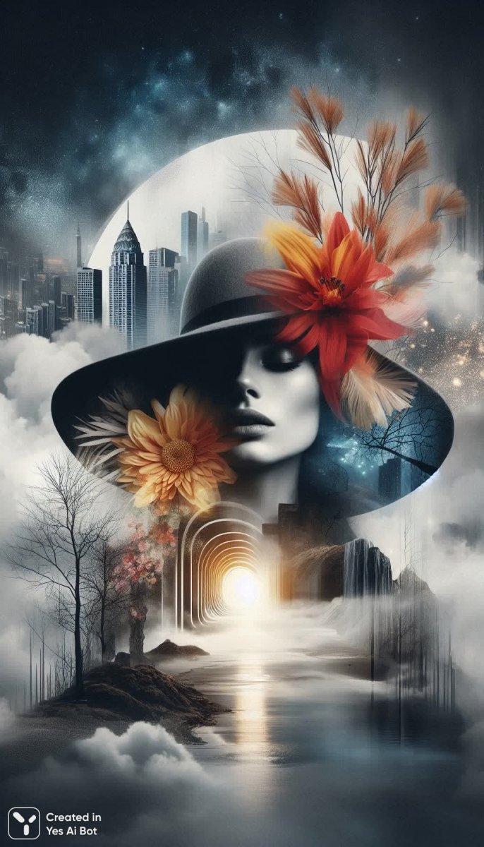 a poetic collage portrait of a woman wearing a hat, her closed eyes blending into a spiral staircase that curves through foggy clouds toward an ethereal light, beneath her silhouette a sparkling night cityscape and a rocky shoreline merge with barren winter trees and vivid tropical flowers in bursts of orange, yellow, red, juxtaposed against monochrome graphic elements, high-fashion editorial and expressive surreal mood, dramatic contrast, soft light beams emphasizing curves, double exposure fine art, modern and mysterious aesthetic, hd, cinematic. a graceful ballerina in a delicate pose whose tutu seamlessly transforms into a field of vivid red poppies and a giant dandelion puff, seeds and petals drifting into a dreamlike sky where a twisted ancient tree and a spiraling staircase entwine, the woman's face elegant and serene, monochrome grayscale skin contrasted with bright floral colors and bold animal print accents, textured broken earth background evoking fragility and beauty, soft ethereal lighting, fine art photo style, expressive modern surrealism, double exposure layered with abstract geometric shapes, hd. a highly stylized surreal portrait of a woman’s profile cracked like dry earth, combined with a full moon held like a hat toward the sky and dramatic clouds swirling into a spiral staircase, soft cloudy sky and misty shoreline beneath, monochrome bw face with vivid tropical flowers and animal print patterns exploding from one side in orange, red, yellow hues, minimalistic white negative space around the composition, high contrast lighting, emotional dreamlike atmosphere, fine art double exposure, cinematic depth, modern editorial and poetic aesthetic, hd.