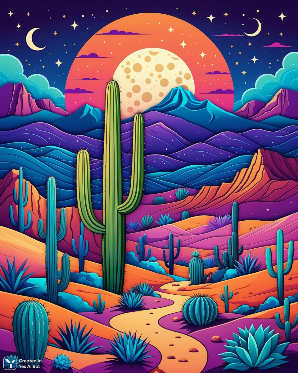Завораживающий пейзаж пустыни, где величественный кактус возвышается в самом центре композиции, словно страж бескрайних песков. Над головой простирается ночное небо, окрашенное в глубокие оттенки фиолетового и синего, усыпанное мерцанием луны и россыпью звезд, создающих атмосферу таинственности и покоя. Земля словно оживает под лунным светом, проявляя причудливые спиральные узоры и геометрические формы, свидетельствующие о скрытой энергии и древних силах природы. Стилизованные растения и холмы дополняют картину, придавая ей сказочный характер. Использование ярких, насыщенных цветов создает ощущение радости и оптимизма, а гротескные контуры графики добавляют легкости и игривости. Этот рисунок в духе doodle-искусства переносит зрителя в фантастический мир, где реальность смешивается с вымыслом, а красота природы предстает в необычном и запоминающемся виде. Кажется, что это ожившая иллюстрация из детской книжки, наполненная волшебством и приключениями, приглашающая отправиться в путешествие по неизведанным землям, где каждый холм и каждое растение хранят свои секреты. Это яркий, энергичный и оптимистичный взгляд на пустынный ландшафт, полный творчества и воображения, способный вдохновить и подарить хорошее настроение