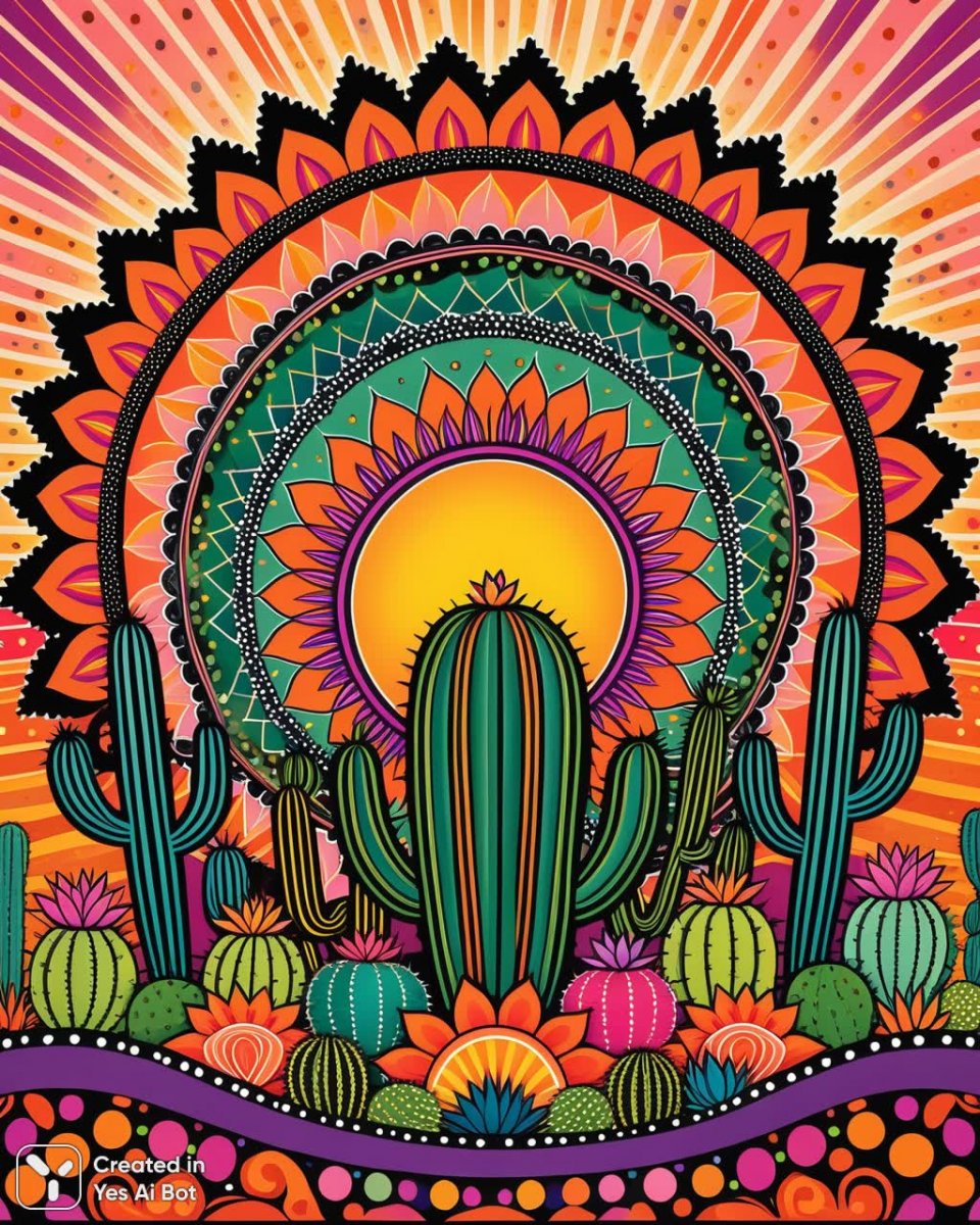 Завораживающая картина, пронизанная духом мексиканского фольклора и психоделической эстетики, представляет собой яркое сочетание природы и мистицизма. В переднем плане изображены кактусы – не просто растения, а живые символы трансформации и духовных поисков, выполненные в наивной манере с акцентом на их необычные формы и текстуры. Центральным элементом композиции является солнце, преображенное в сложный mandala-подобный узор. Его лучи сплетаются в замысловатые орнаменты, напоминающие древние символы и священные геометрические фигуры, создавая ощущение космической гармонии и бесконечности. Фон картины представляет собой волнующий калейдоскоп многоцветных оттенков, перетекающих друг в друга плавными линиями. Яркие оранжевые, розовые, зеленые и пурпурные тона пульсируют энергией и создают ощущение движения, погружая зрителя в мир фантазий и галлюцинаций. Дополнительный эффект достигается благодаря декоративным точкам и зигзагам, которые разбросаны по всей поверхности полотна, словно искры энергии или звездная пыль. Четкие черные контуры подчеркивают каждую деталь, придавая изображению выразительность и графичность. Вся картина пронизана духом наивного искусства, с его простотой форм, яркими цветами и непосредственным восприятием мира, что делает ее уникальным произведением, сочетающим в себе элементы фольклора, психоделии и современного искусства. Это визуальное путешествие в глубины подсознания, где реальность смешивается с фантазией, а обыденные вещи обретают сакральный смысл