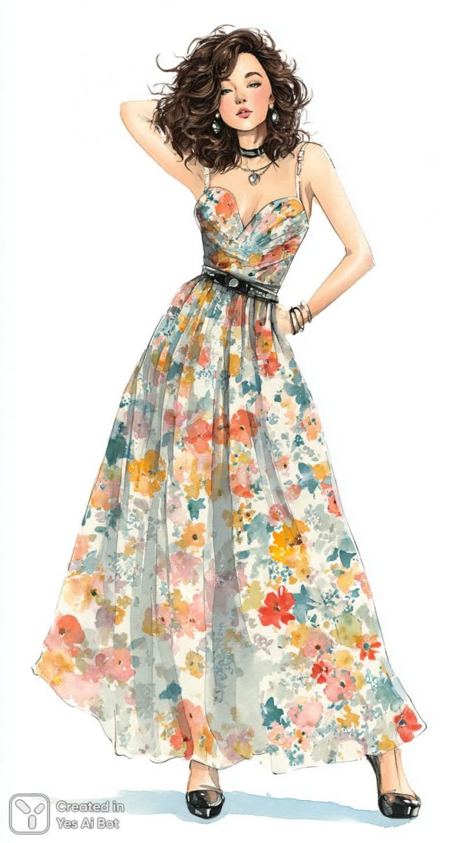 woman wearing short white dress with floral pattern corset-style bodice and sweetheart neckline, full skirt flowing to floor, black strappy heels with laces, choker necklace, long dark hair in loose waves, pose confident with one hand on hip, humorous tag: "she brought flowers and opinions :) ", white bg.