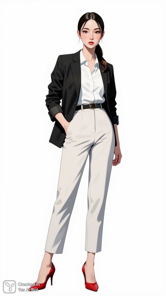 Элегантный образ современной деловой женщины воплощен в этом снимке. Идеально сидячий блейзер подчеркивает фигуру и добавляет уверенности, а белоснежная блуза придает легкости и свежести всему ансамблю. Высокая посадка брюк создает удлиненный силуэт, а черный пояс акцентирует талию, формируя женственный контур. Яркие красные туфли на шпильке добавляют образу динамичности и энергии, делая его запоминающимся. Волосы, собранные в гладкий высокий хвост, подчеркивают четкость линий и завершают стильный look. Мягкие текстуры, словно написанные акварелью, придают изображению нежность и утонченность. Минималистичный макияж позволяет сосредоточить внимание на безупречной внешности модели и ее уверенной осанке. Фон нейтрального белого цвета создает ощущение чистоты и простора, позволяя деталям образа максимально раскрыться. Этот образ – гармоничное сочетание профессиональной строгости и модных тенденций, отражающее современный взгляд на деловой стиль. Он идеально подойдет для вдохновения при создании капсульного гардероба или поиска идеального решения для важной встречи. Впечатление легкости и уверенности в себе создается благодаря продуманному подбору деталей и безупречному исполнению. Этот образ – ода женственности, элегантности и современному стилю