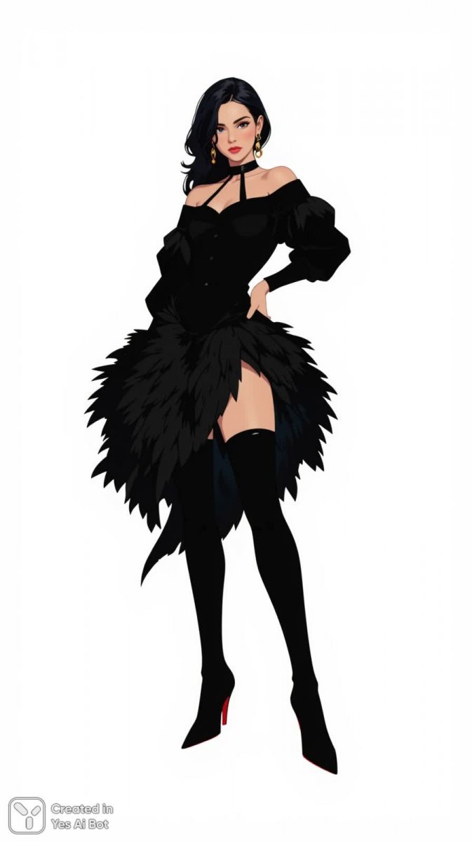 Изысканное воплощение элегантности и дерзости в образе женщины, облаченной в роскошное черное платье. Модель с открытыми плечами и высоким воротником подчеркивает утонченную линию шеи и плеч, а пышная юбка из перьев создает эффектный и запоминающийся силуэт, ниспадающий ниже колен. Акцент на талии формирует женственный контур фигуры, добавляя образу соблазнительности. Яркий акцент – черные сапоги выше колена с красными подошвами, которые едва заметно выглядывают из-под платья, придавая луку нотку бунтарства и неповторимости. Длинные темные волосы собраны в гладкую высокую прическу, создающую ощущение чистоты линий и подчеркивающую драматизм позы. Женщина запечатлена в эффектной композиции, где одна рука грациозно лежит на бедре, демонстрируя уверенность и внутреннюю силу. Этот образ – квинтэссенция кутюрного гламура, воплощенная в каждой детали. Белый фон позволяет полностью сосредоточиться на красоте модели и великолепии ее наряда, создавая атмосферу изысканности и роскоши. Это визуальное представление истинного стиля и безупречного вкуса, где каждый элемент идеально сочетается друг с другом, чтобы создать поистине незабываемый образ. Вся композиция пронизана чувственностью и уверенностью, демонстрируя силу женственности и ее неотразимое очарование