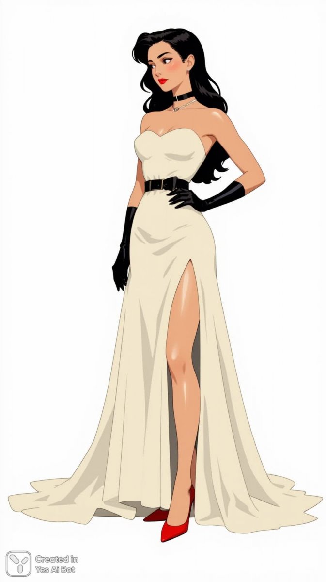 Изящная женщина предстает в роскошном платье без бретелек с глубоким декольте 'сердце', ниспадающим пышным юбом и смелым высоким разрезом на боку. Черный атласный пояс-бант подчеркивает талию, создавая утонченный силуэт. Элегантные черные перчатки дополняют образ, а ярко-красные туфли на высоком каблуке добавляют нотку дерзости и драматизма. Длинные темные волосы собраны в гладкую высокую прическу, акцентируя внимание на изысканном ожерелье-чокер. Она грациозно опирается рукой на бедро, демонстрируя уверенность и элегантную осанку. Вся композиция излучает ощущение драматичной утонченности, сочетая в себе классическую красоту и современный стиль. Светлый фон позволяет полностью сосредоточиться на деталях образа, подчеркивая безупречный вкус и внимание к каждой мелочи. Это воплощение женственности, изысканности и уверенности в себе, создающее незабываемое впечатление своей гармонией и элегантностью. Идеальный пример сочетания классических элементов с современными акцентами, демонстрирующий высочайший уровень стиля и вкуса