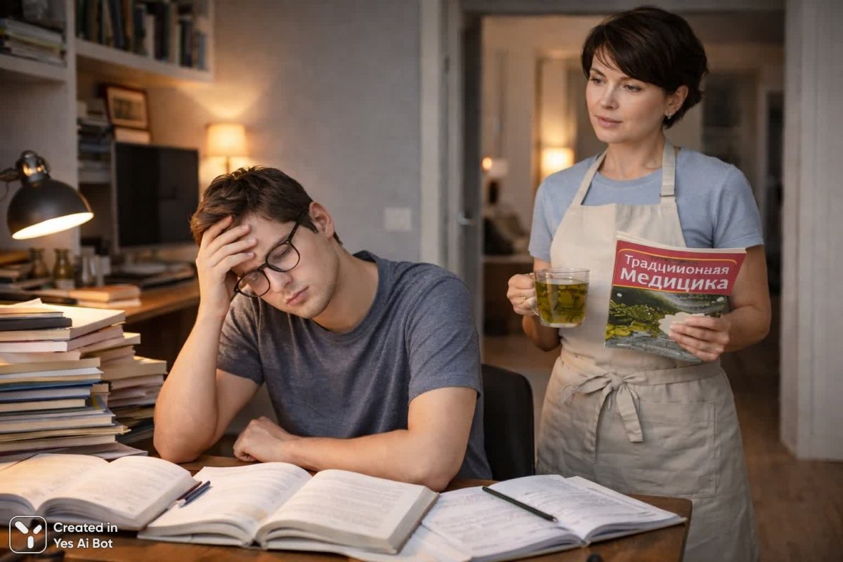 Современная комната. За письменным столом сидит студент, в очках, уставший, вокруг много учебников, раскрытые тетрадки. Входит его мама, в фартуке, брюнетка с красивой стрижкой, лет 40, в одной руке держит стакан с травяным напитком, в другой журнал "Традиционная Медицина"