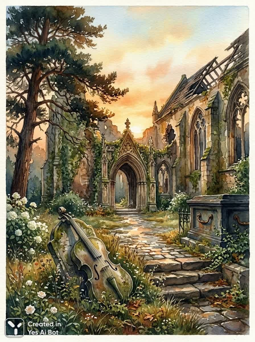 Завораживающая акварельная картина изображает унылый двор разрушенного готического собора, пропитанный атмосферой тихой меланхолии и безмолвного величия. В передней части композиции покоится массивный, поросший травой надгробный камень причудливой формы – напоминающий скрипку, лежащую на боку. Белые цветущие кусты слегка скрывают его, добавляя картине нотку хрупкой красоты и увядания. Справа от зрителя видны каменные ступени, ведущие к темному строению, похожему на саркофаг, украшенному бронзовыми ручками, словно приглашающим в мир забытых тайн. Центральная часть двора представляет собой мощеную площадь, отражающую мягкий свет и уводящую взгляд к величественному арочному проему собора, являющемуся главным фокусом картины. Слева возвышается могучий старый пих с густой листвой, его ветви тянутся к выветренным каменным стенам храма, словно пытаясь обнять их и защитить от времени. Правее виден сам собор – свидетель истории, несущий на себе следы разрушения: осыпающаяся кладка и частично обрушившаяся крыша напоминают о бренности всего сущего. Небо окрашено в приглушенные оттенки желтого и оранжевого, что создает впечатление рассвета или заката и наполняет сцену теплым, но печальным свечением. Рассеянный, атмосферный свет подчеркивает текстуру камня и листвы, оживляя каждую деталь картины. Камера расположена на уровне глаз зрителя, обращенная к двору, а композиция выдержана в умеренном ключе. Общее впечатление – это ощущение безмятежной разрухи и тихой красоты, акцент на неумолимом течении времени и постепенном возвращении природы к искусственно созданным сооружениям. Это картина о цикличности жизни, где руины становятся частью нового ландшафта, а прошлое переплетается с настоящим в гармоничном сочетании