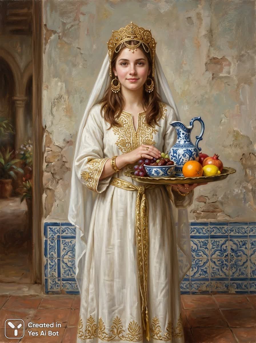 Изящная юная женщина в роскошном наряде предстает перед зрителем в этом завораживающем портрете. Ее светлая кожа и каштановые волосы контрастируют с богатой золотой отделкой головного убора и крупных серег, подчеркивая ее красоту и статус. Нежный взгляд выражает спокойствие и достоинство, а легкое прикосновение улыбки добавляет шарма этому образу. Она облачена в струящееся платье цвета слоновой кости, украшенное замысловатой золотой вышивкой на лифе и рукавах, что говорит о ее высоком положении. Золотой пояс подчеркивает тонкую талию, а невесомый белый вуаль изящно ниспадает на голову и плечи, создавая атмосферу загадочности и благородства. В руках она несет латунную подставку с дарами: изящный кувшин в сине-белую гамму, небольшую чашу и сочные фрукты – апельсин и лимон. Это может символизировать щедрость и гостеприимство. Фон изображения представляет собой фактурную стену приглушенных землистых тонов с декоративной плиточной отделкой внизу, украшенной сложными сине-белыми узорами, что добавляет глубины и текстуры композиции. Мягкое теплое освещение, льющееся сверху слева, создает тонкие тени и подчеркивает фактуру тканей и предметов на подставке. Общая атмосфера пропитана элегантностью и мягким служением, передавая ощущение спокойствия и умиротворения в реалистичном стиле масляной живописи с легкой размытостью фона. Ракурс соответствует уровню глаз модели, что позволяет зрителю установить личный контакт с изображаемой женщиной. Это портрет, наполненный достоинством и внутренней гармонией, запечатленный с большой художественной тщательностью