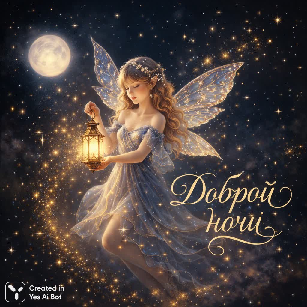 Завораживающая картина, сотканная из сказочных грез, представляет собой фею ночного света, парящую в серебряном лунном сиянии. Ее крошечные крылья излучают мягкое, мерцающее свечение, словно россыпь драгоценных камней, а вокруг нее танцуют золотистые искры – воплощение волшебства и умиротворения. На темном бархатном фоне ночного неба, усыпанного мириадами звезд, фея держит в руках светящийся фонарик, словно маяк надежды и добрых сновидений. Рядом изящно расположилась надпись на родном языке – доброй ночи – нежное пожелание спокойной ночи и сладких грез для каждого, кто взглянет на это чудо. Вся сцена напоминает волшебную иллюстрацию из любимой книги снов, наполненную нежностью, тайной и завораживающей магией ночного мира. Это визуальное воплощение сказки, способное унести в мир грез и подарить ощущение спокойствия и умиротворения, окутывая теплом волшебных лучей и даря надежду на светлые сновидения. Кажется, будто сама ночь шепчет добрые слова, укрывая своим бархатным покрывалом все живое и наполняя сердца тихой радостью и ожиданием чуда. Это не просто изображение – это приглашение в мир сказки, где доброта и волшебство правят бал